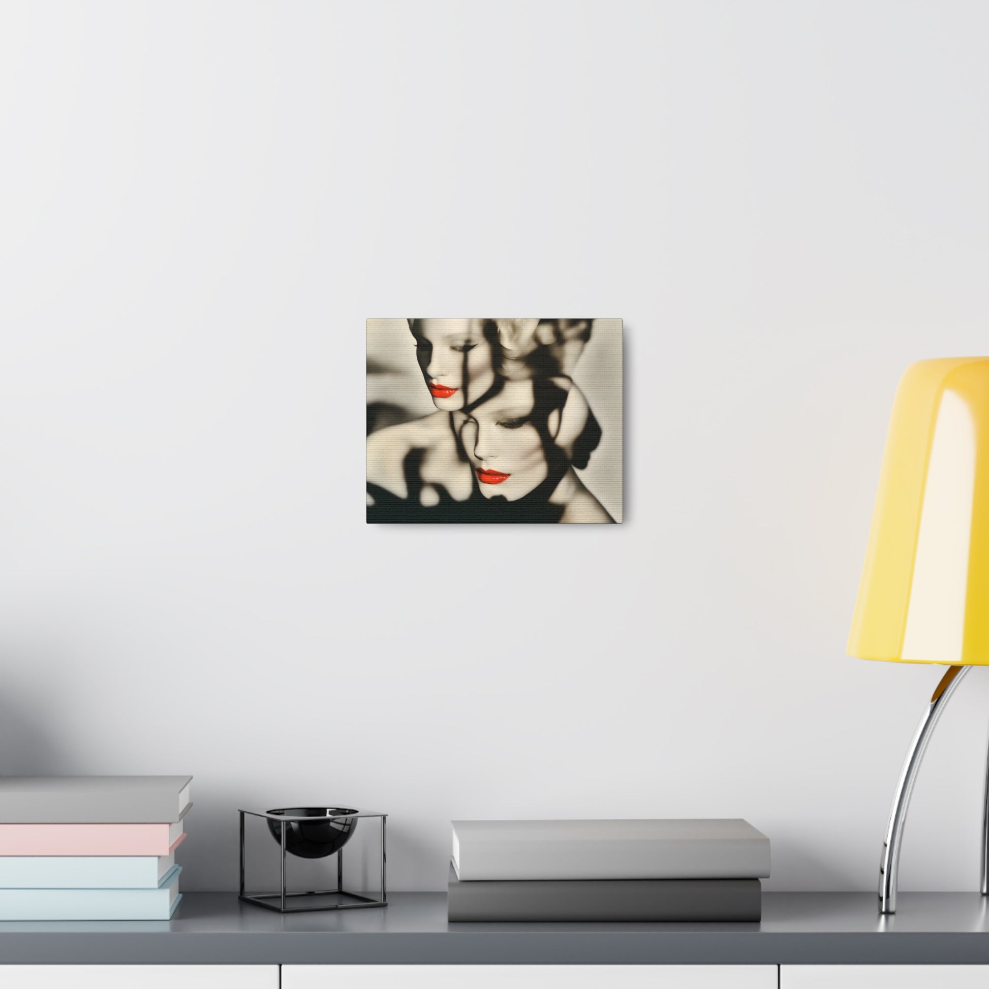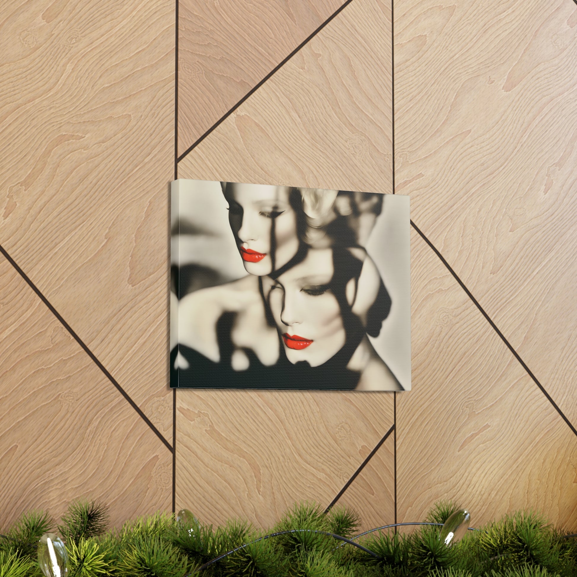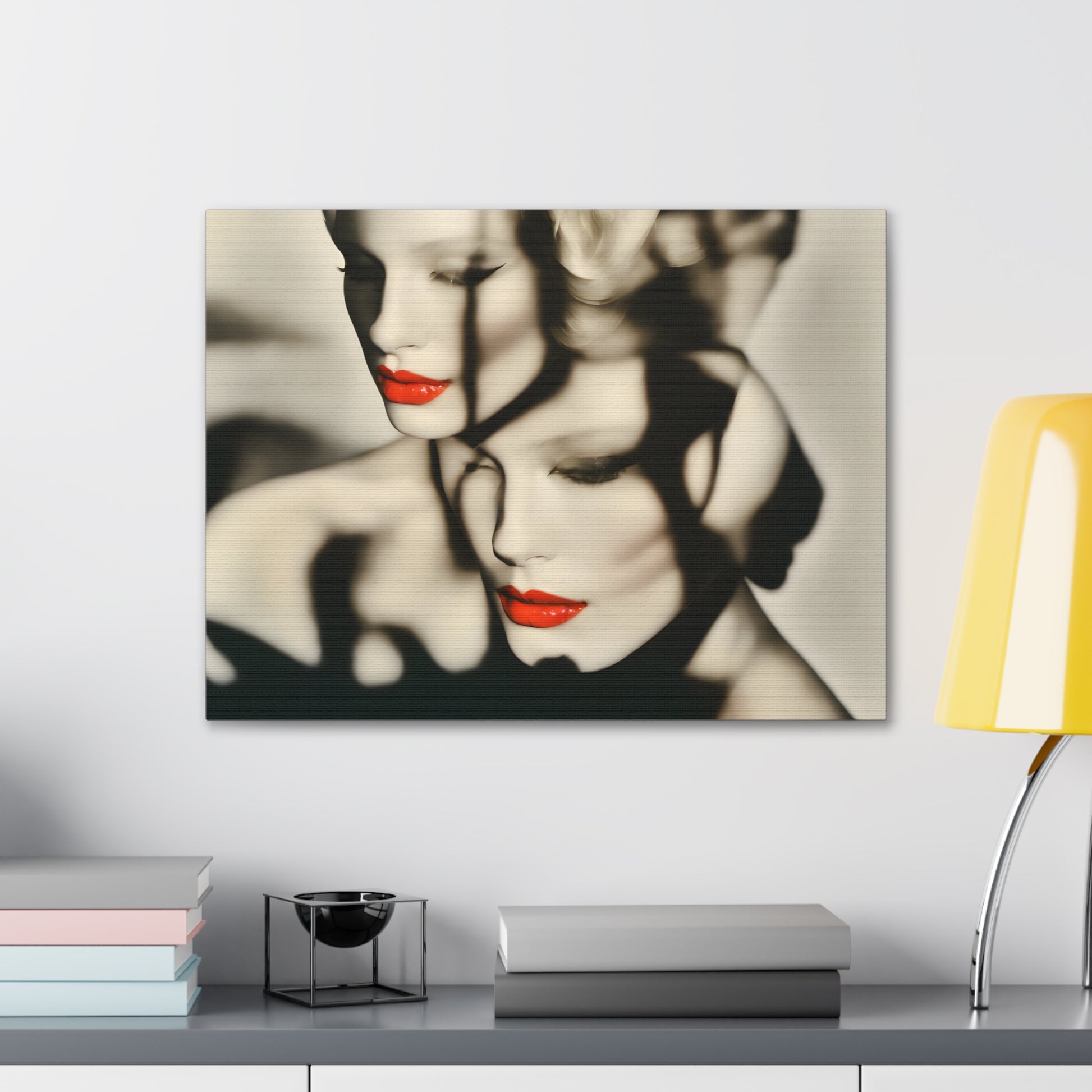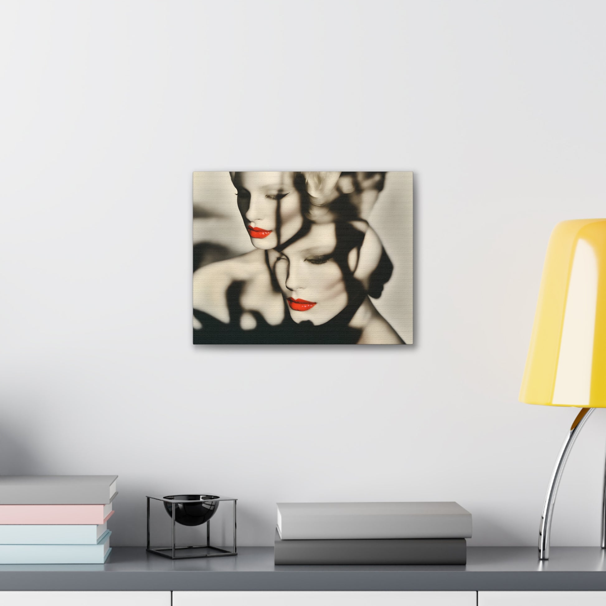 Indulge in the timeless allure of "Whispers of Elegance: Iconic Wall Décor." This captivating canvas artwork weaves a narrative of refined beauty and sophistication, featuring a repeating pattern of a lady with closed eyes and scarlet lips, gracefully adorned in hues of white and grey.