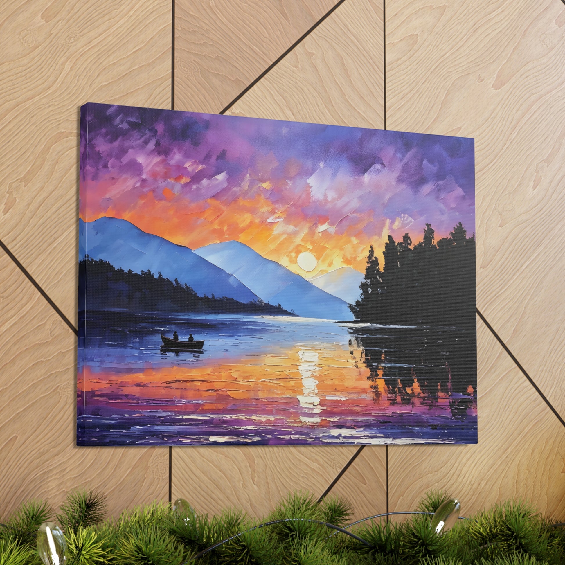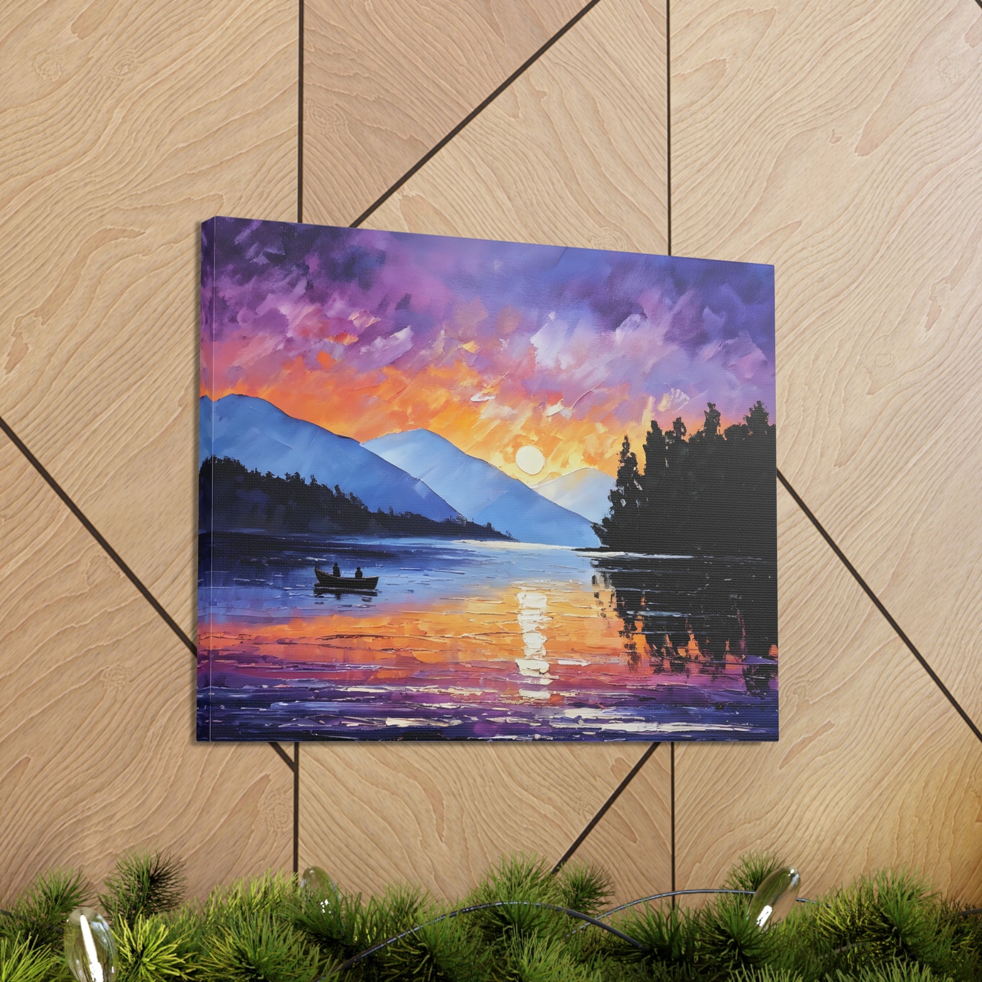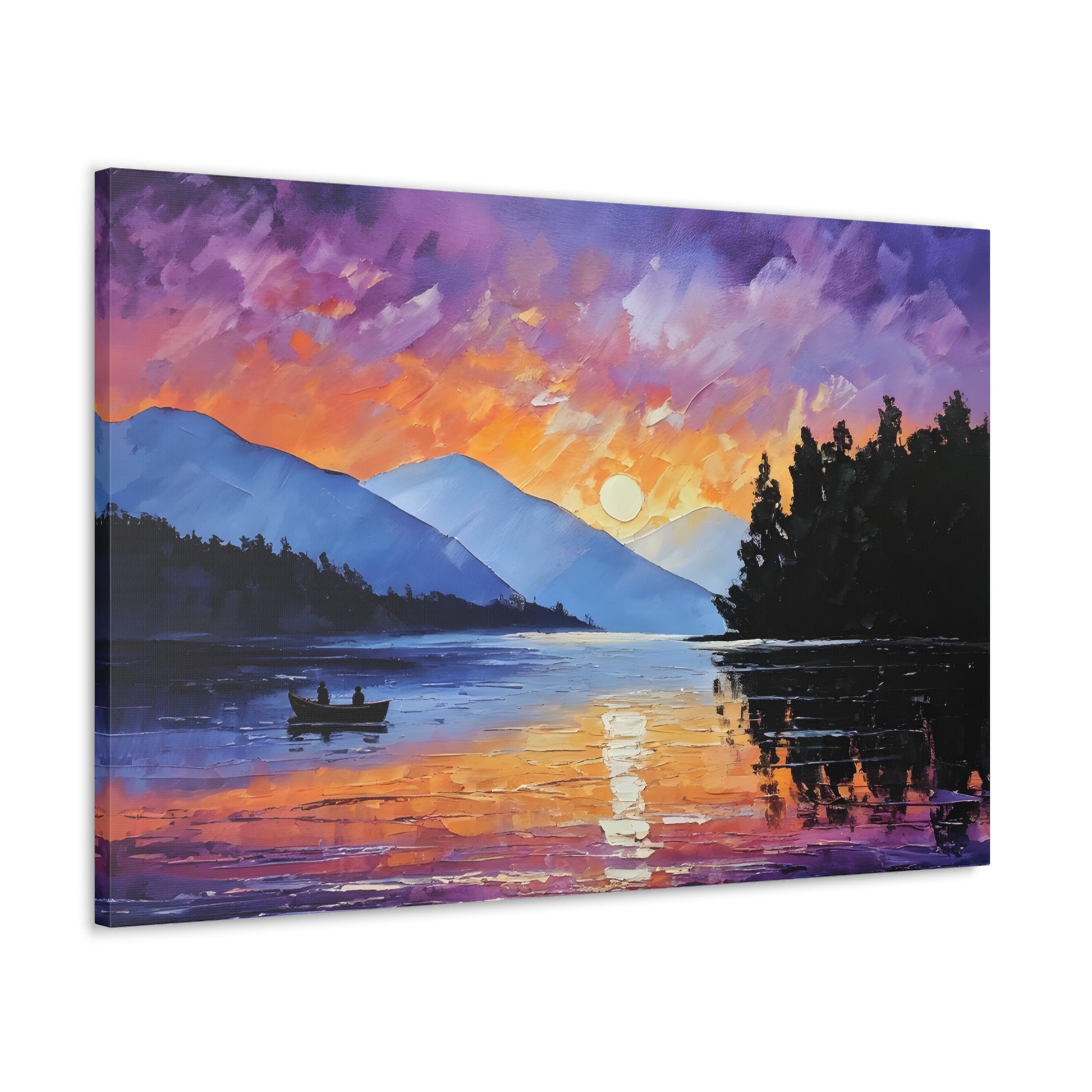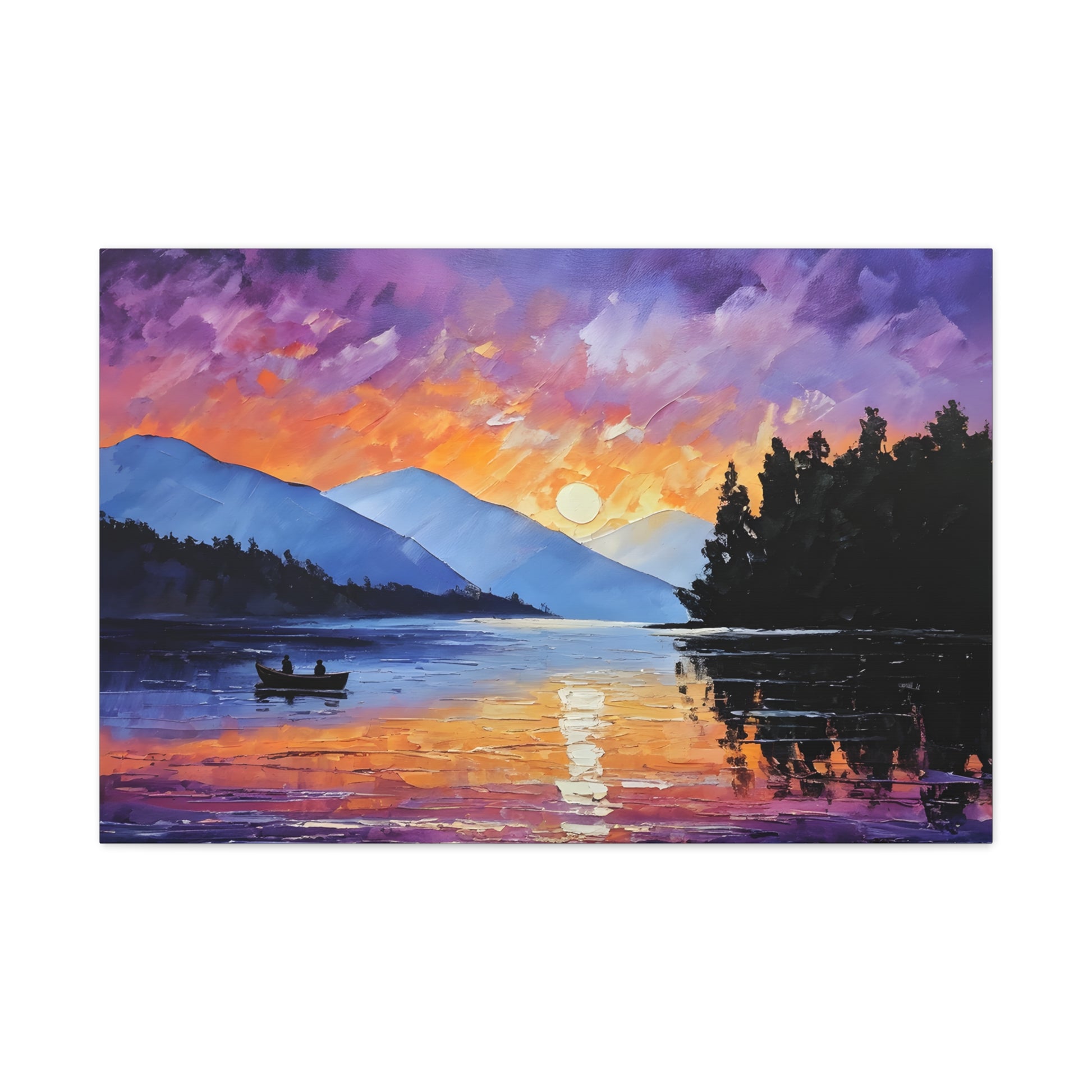 Experience the magical hour of dawn with "Wilderness Dawn." This oil painting captures the rich purples and fiery oranges of the sky as the sun rises over a tranquil mountain lake, with a pair of rowers in the serene water.