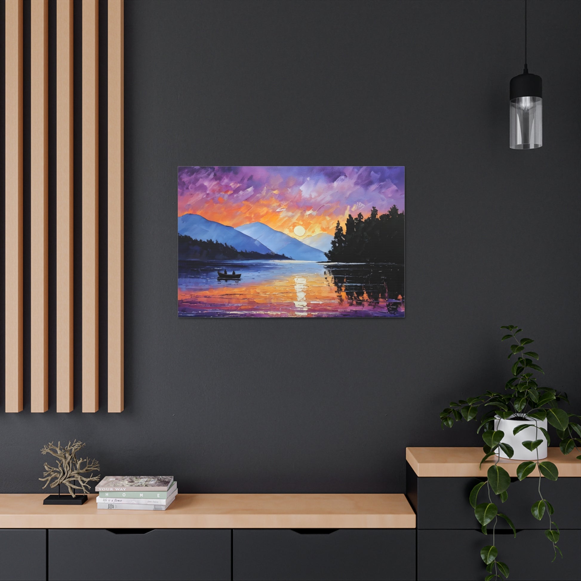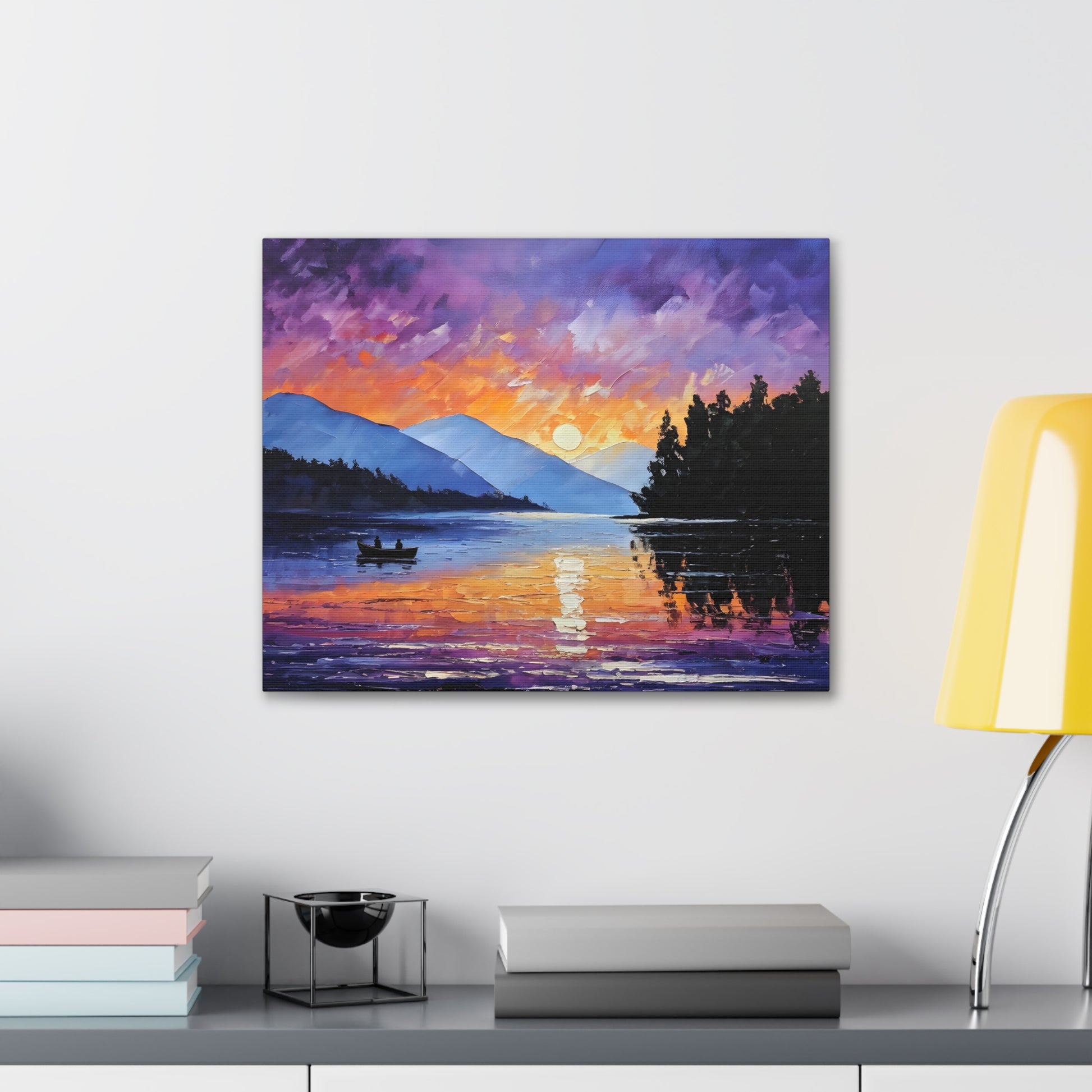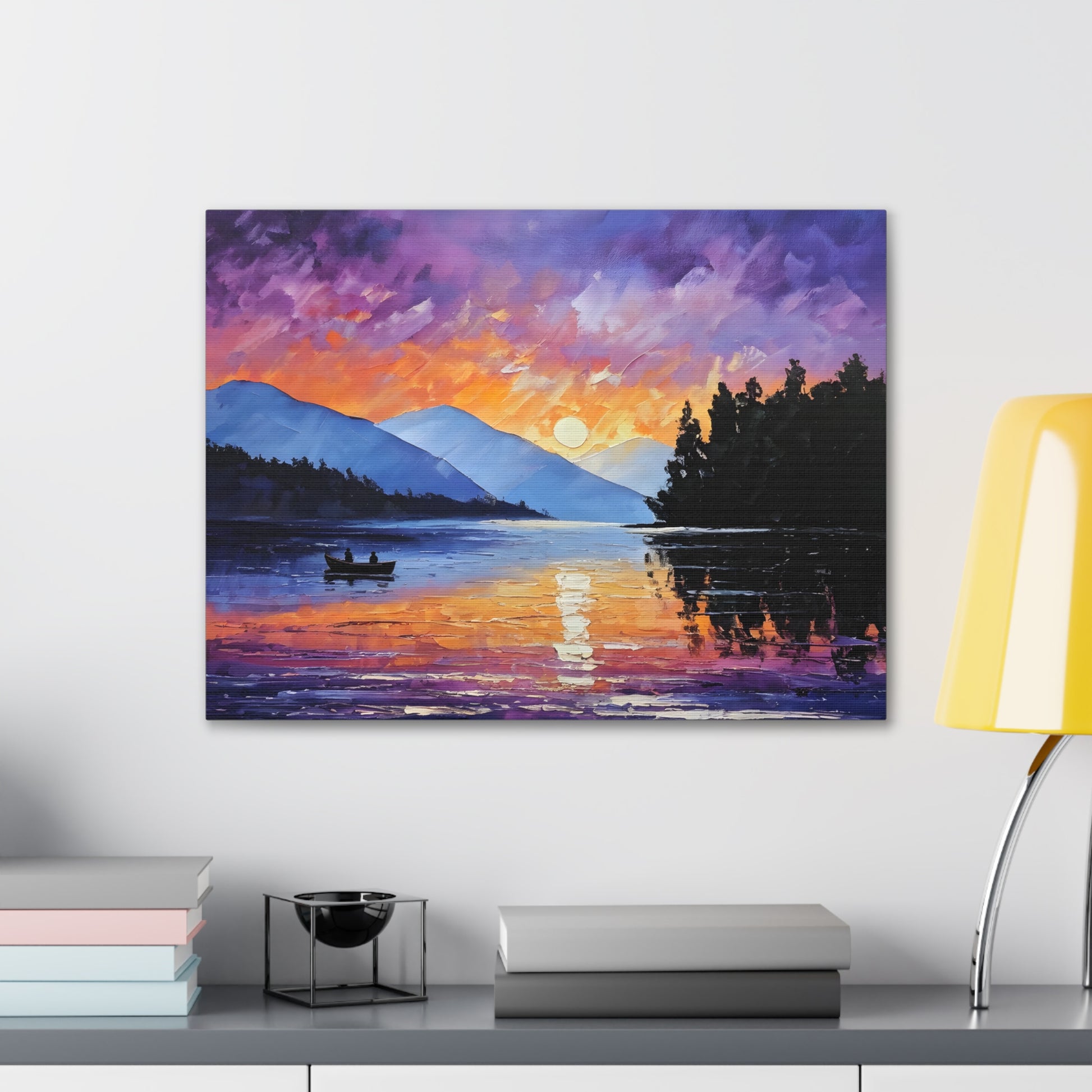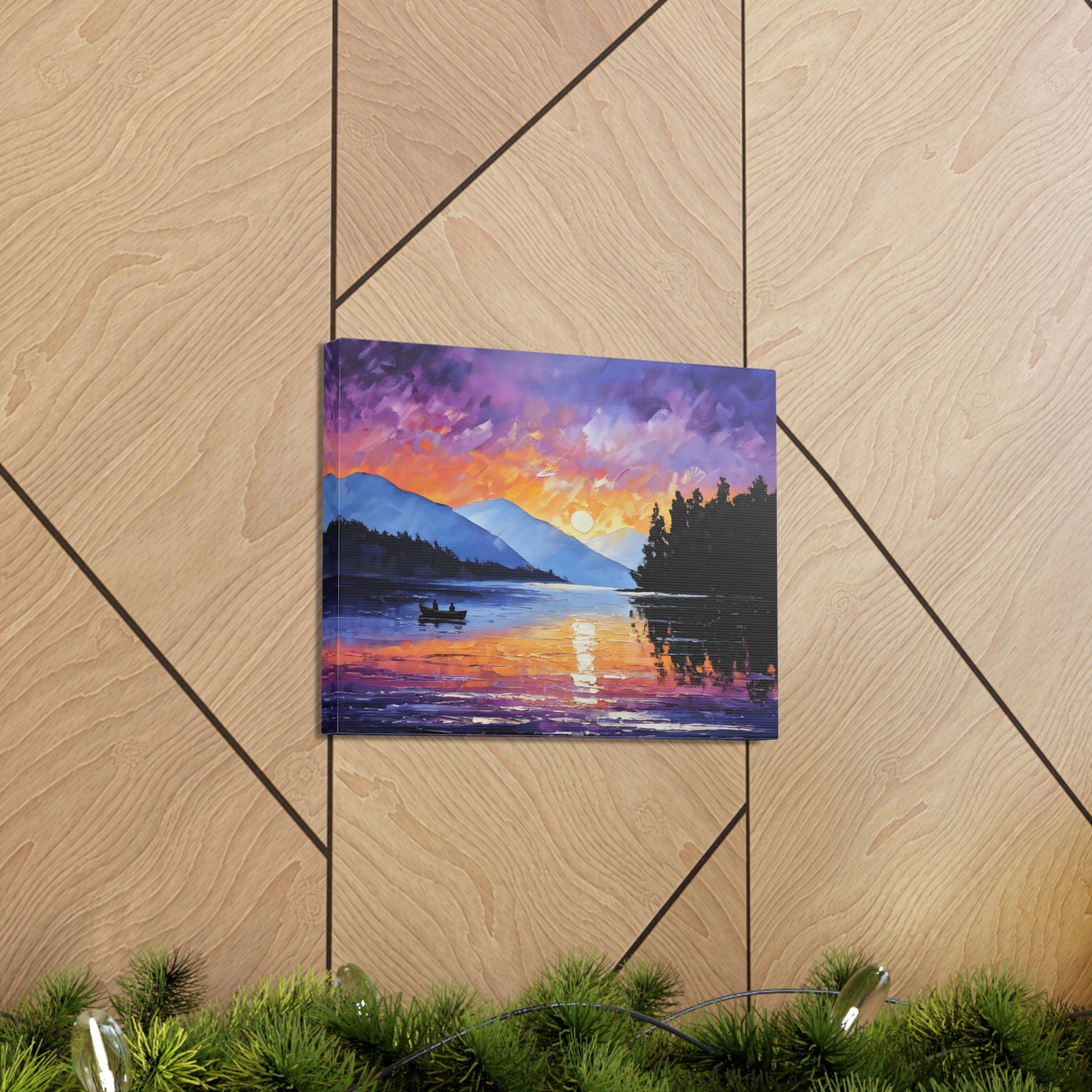 Experience the magical hour of dawn with "Wilderness Dawn." This oil painting captures the rich purples and fiery oranges of the sky as the sun rises over a tranquil mountain lake, with a pair of rowers in the serene water.