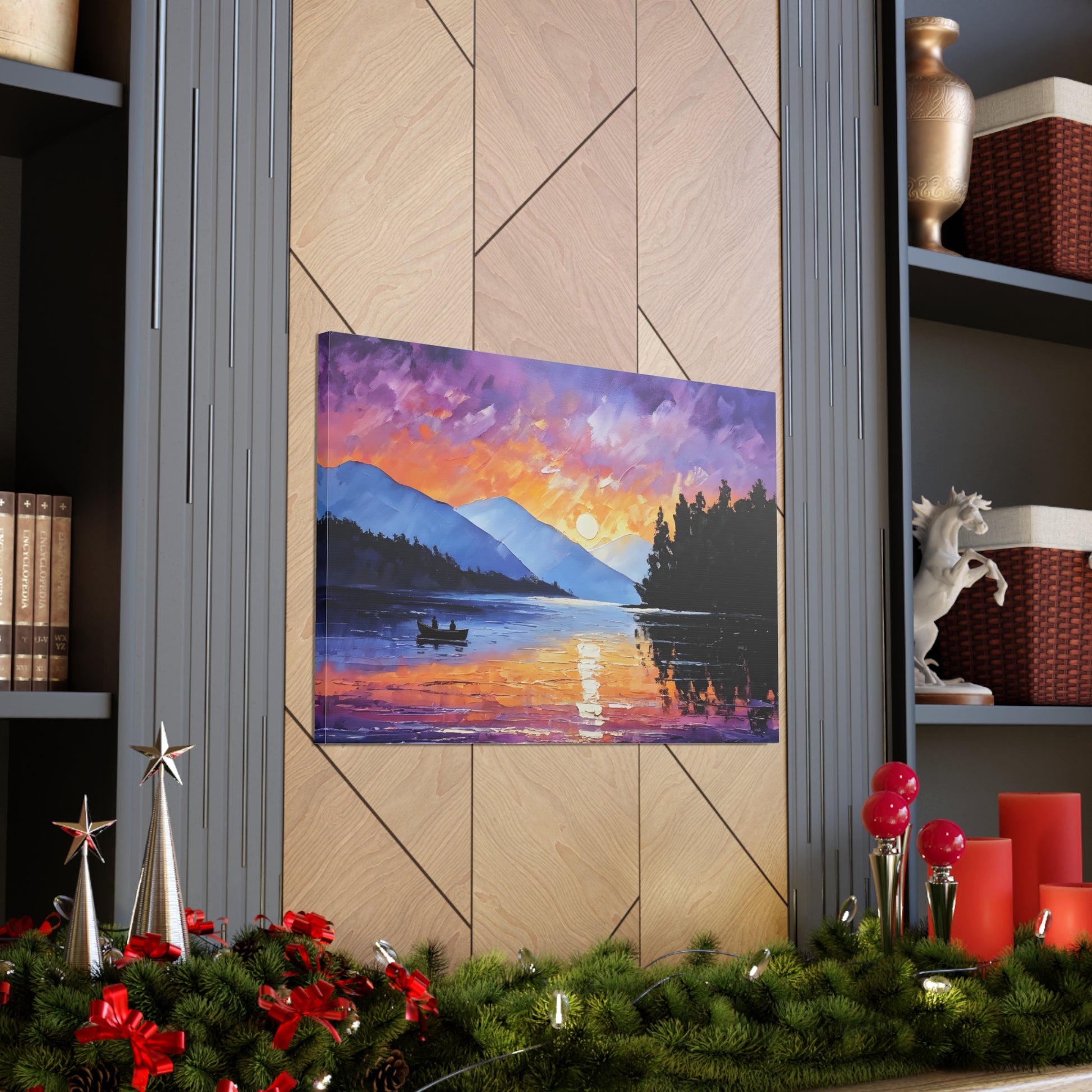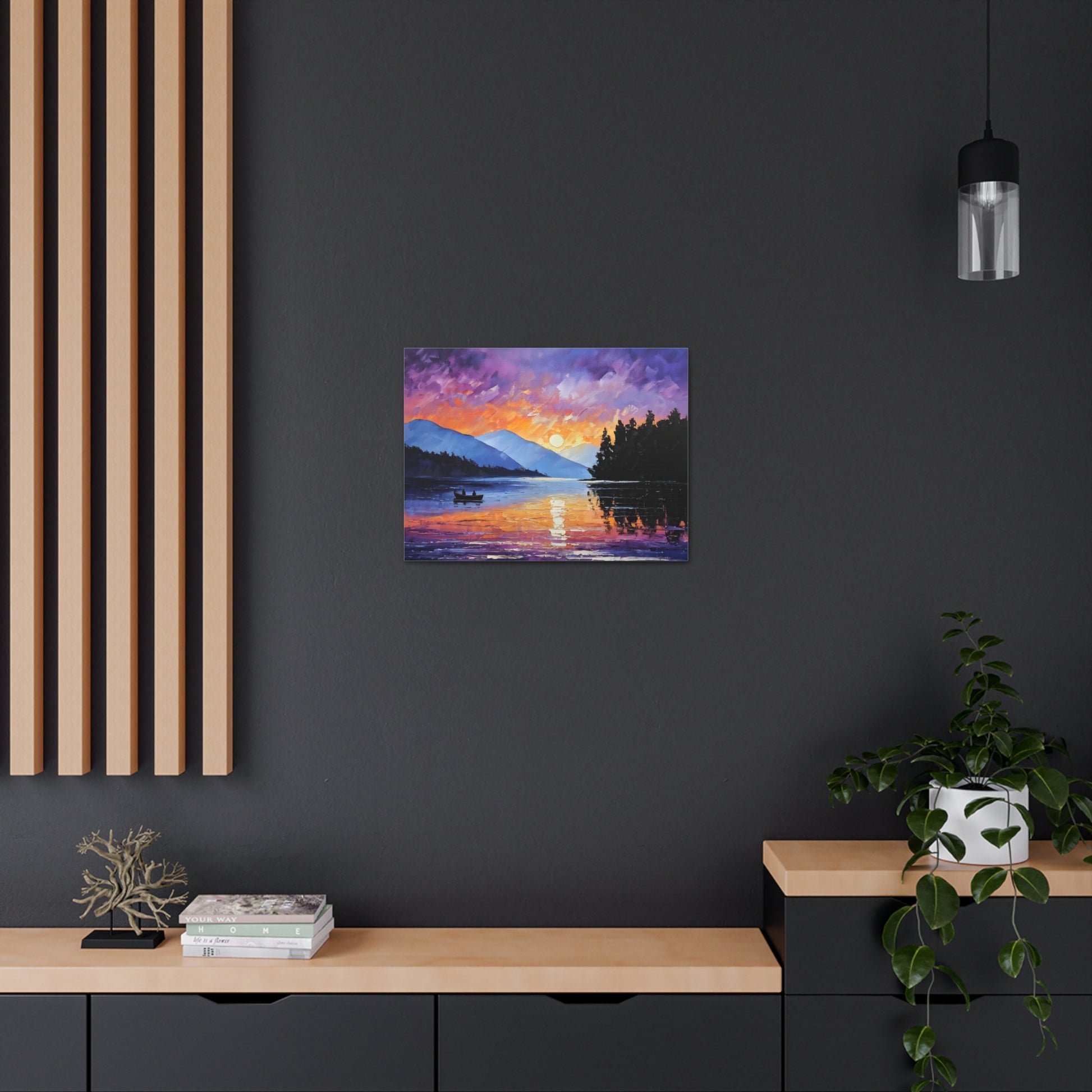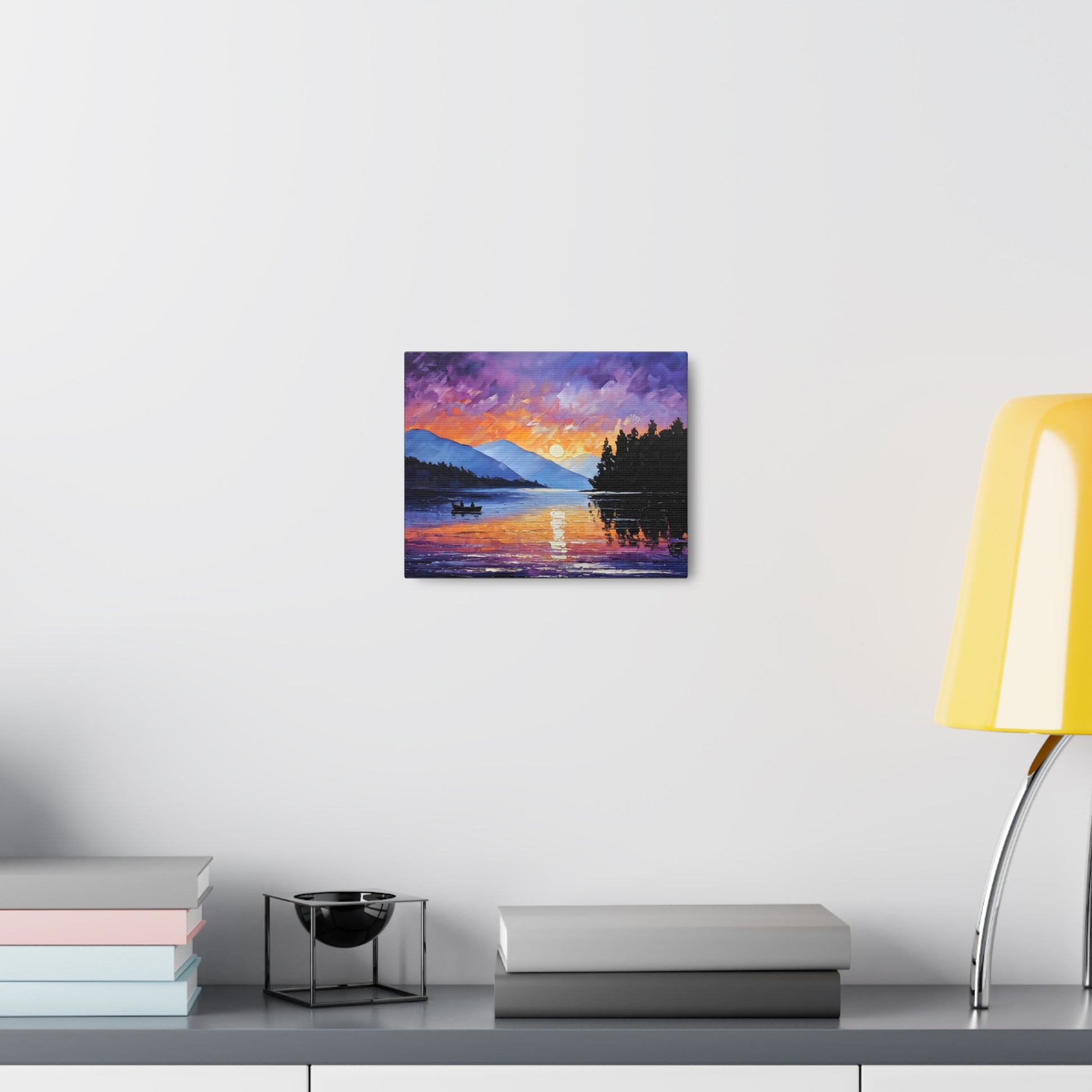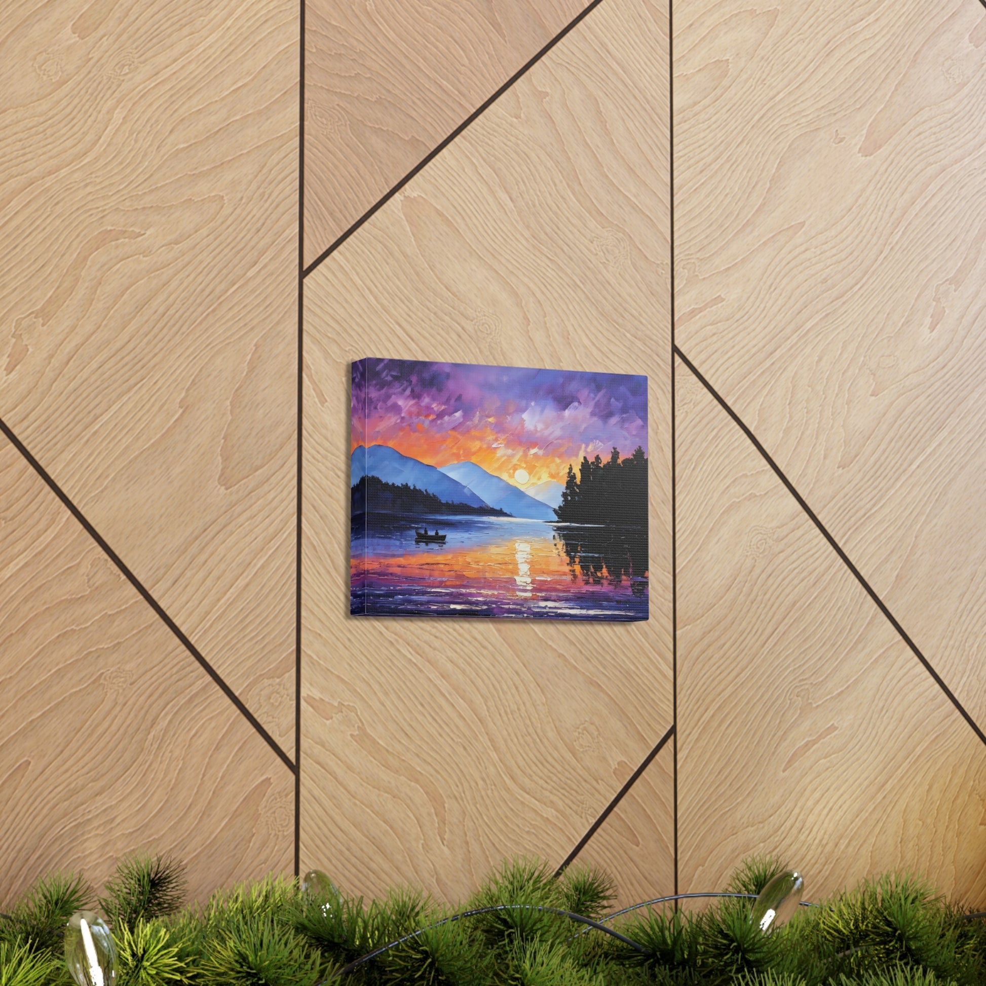 Experience the magical hour of dawn with "Wilderness Dawn." This oil painting captures the rich purples and fiery oranges of the sky as the sun rises over a tranquil mountain lake, with a pair of rowers in the serene water.