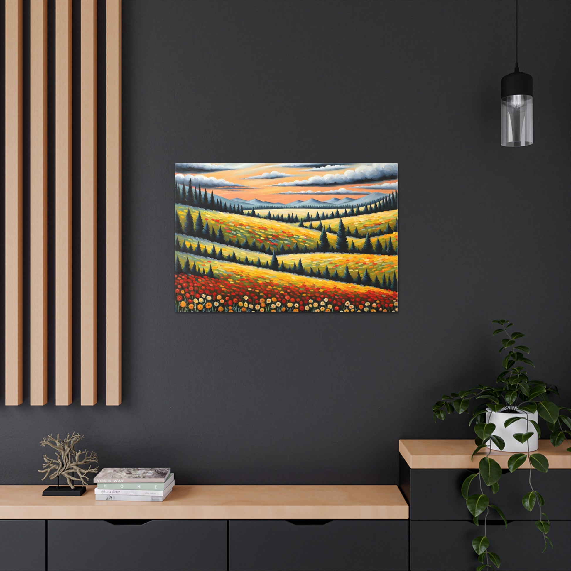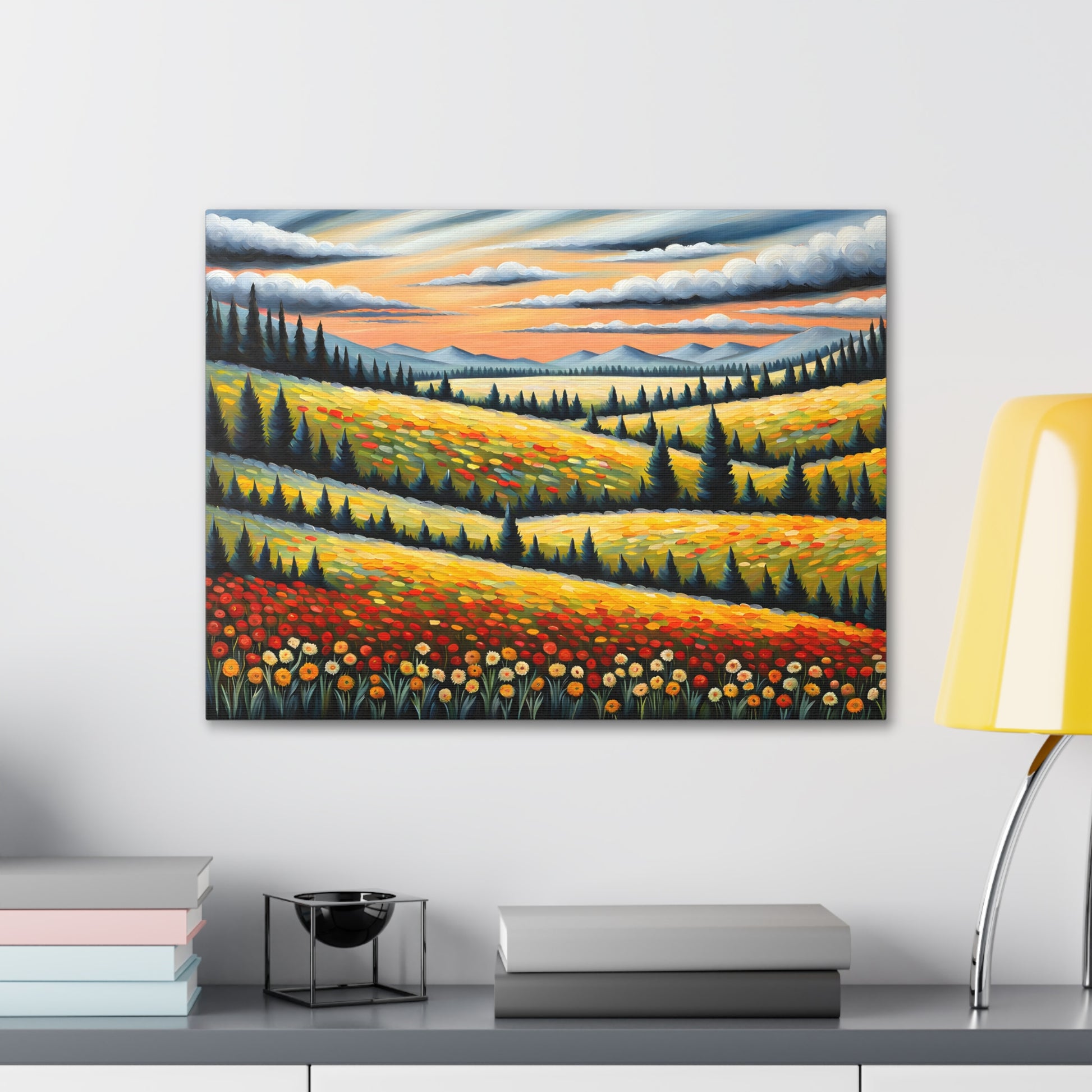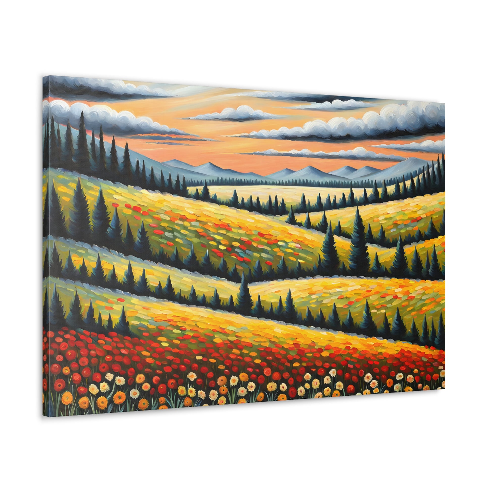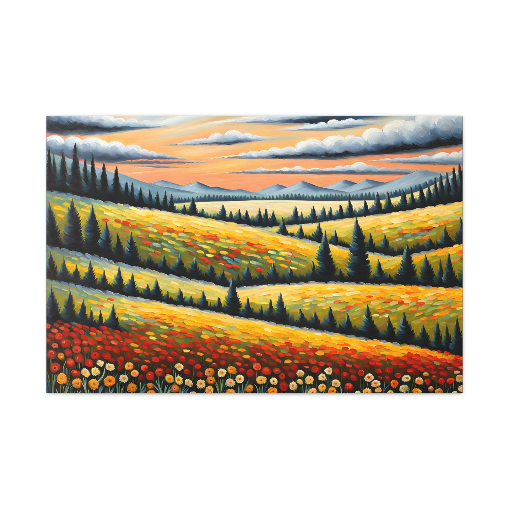 Bask in the vibrant colors of nature with "Wildflower Haven." This oil painting on cotton canvas captures a stunning meadow bursting with wildflowers, set against rolling hills and distant mountains. Perfect for creating a lively and refreshing atmosphere in your indoor space.