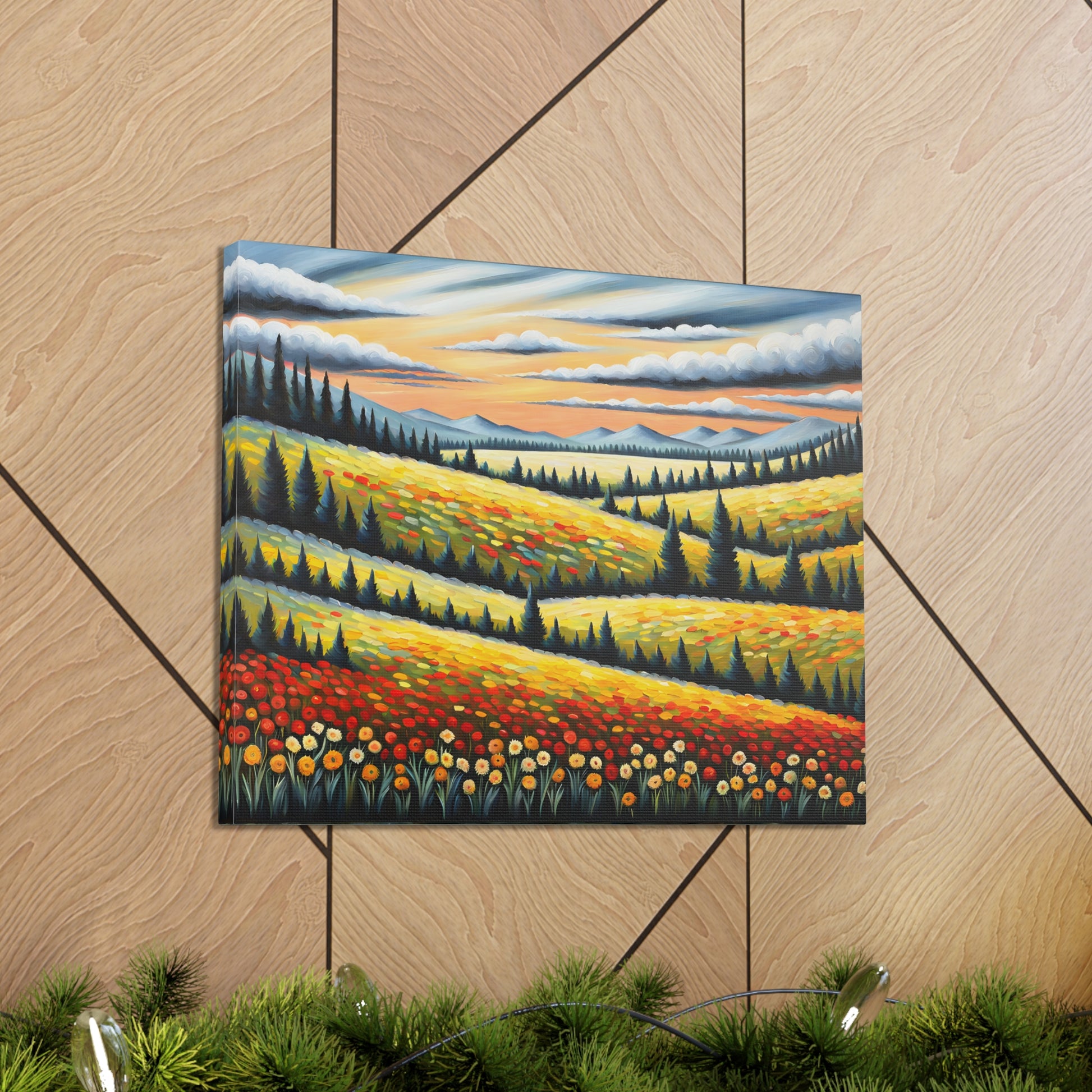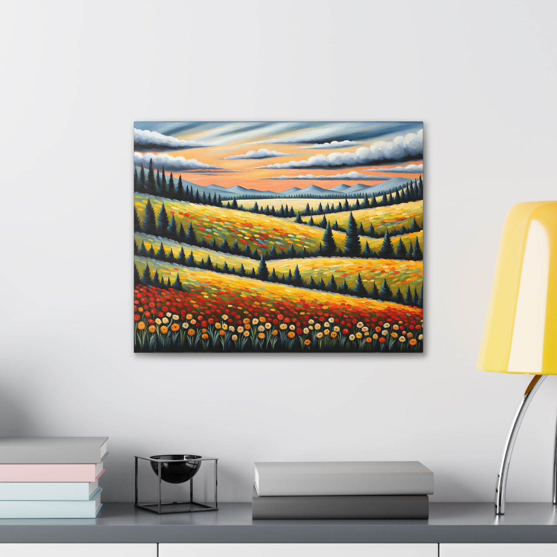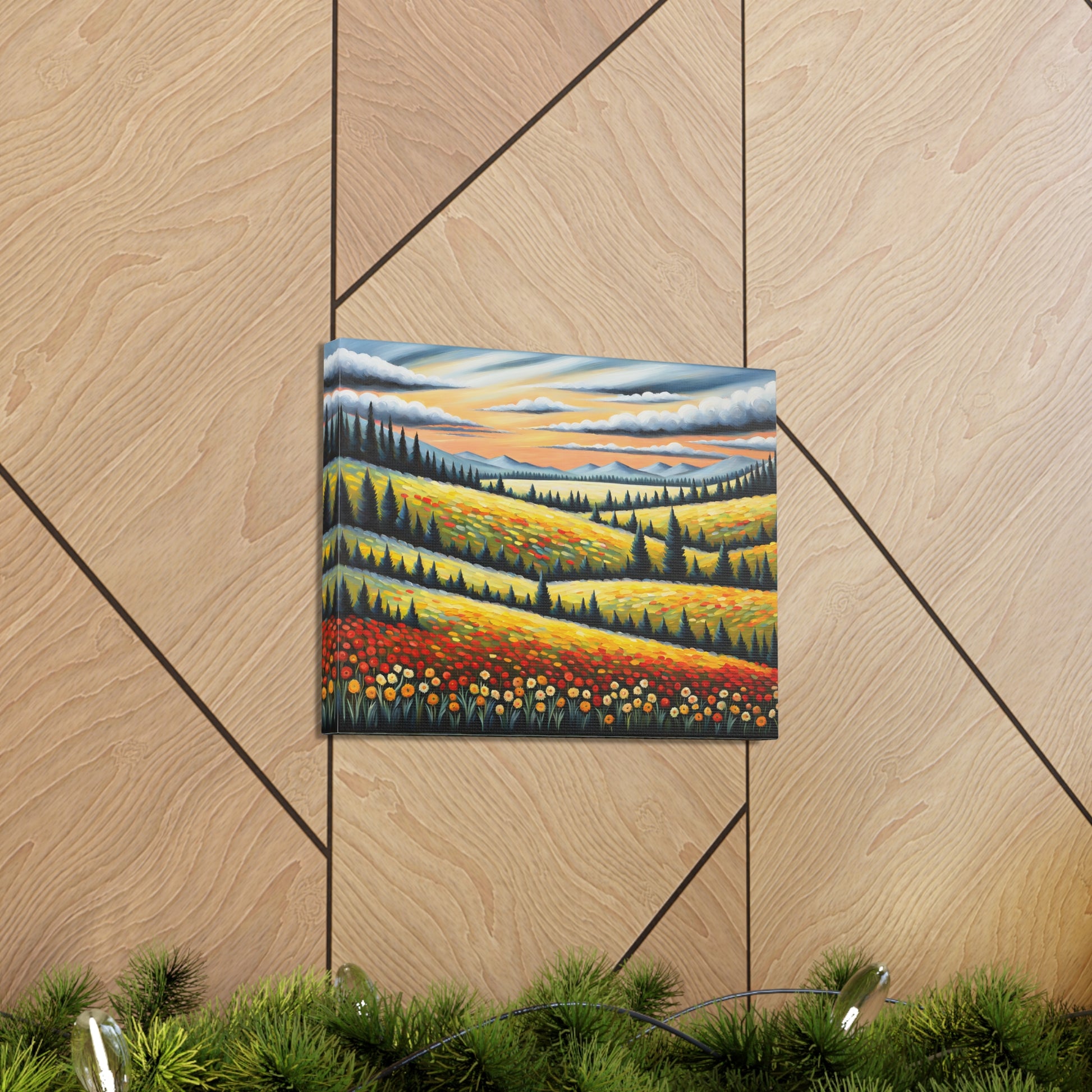 Bask in the vibrant colors of nature with "Wildflower Haven." This oil painting on cotton canvas captures a stunning meadow bursting with wildflowers, set against rolling hills and distant mountains. Perfect for creating a lively and refreshing atmosphere in your indoor space.