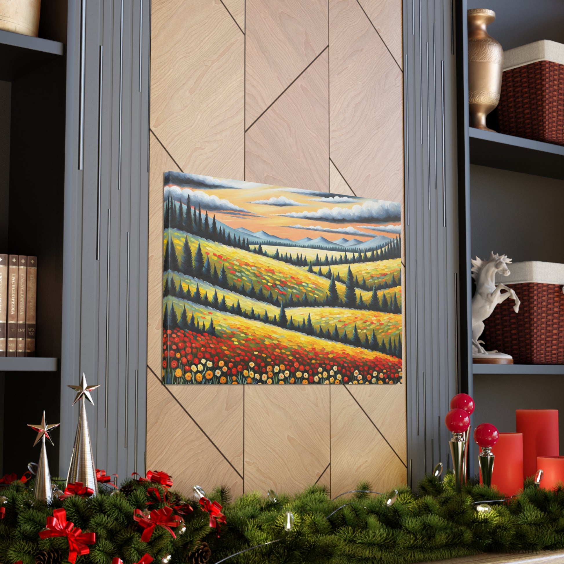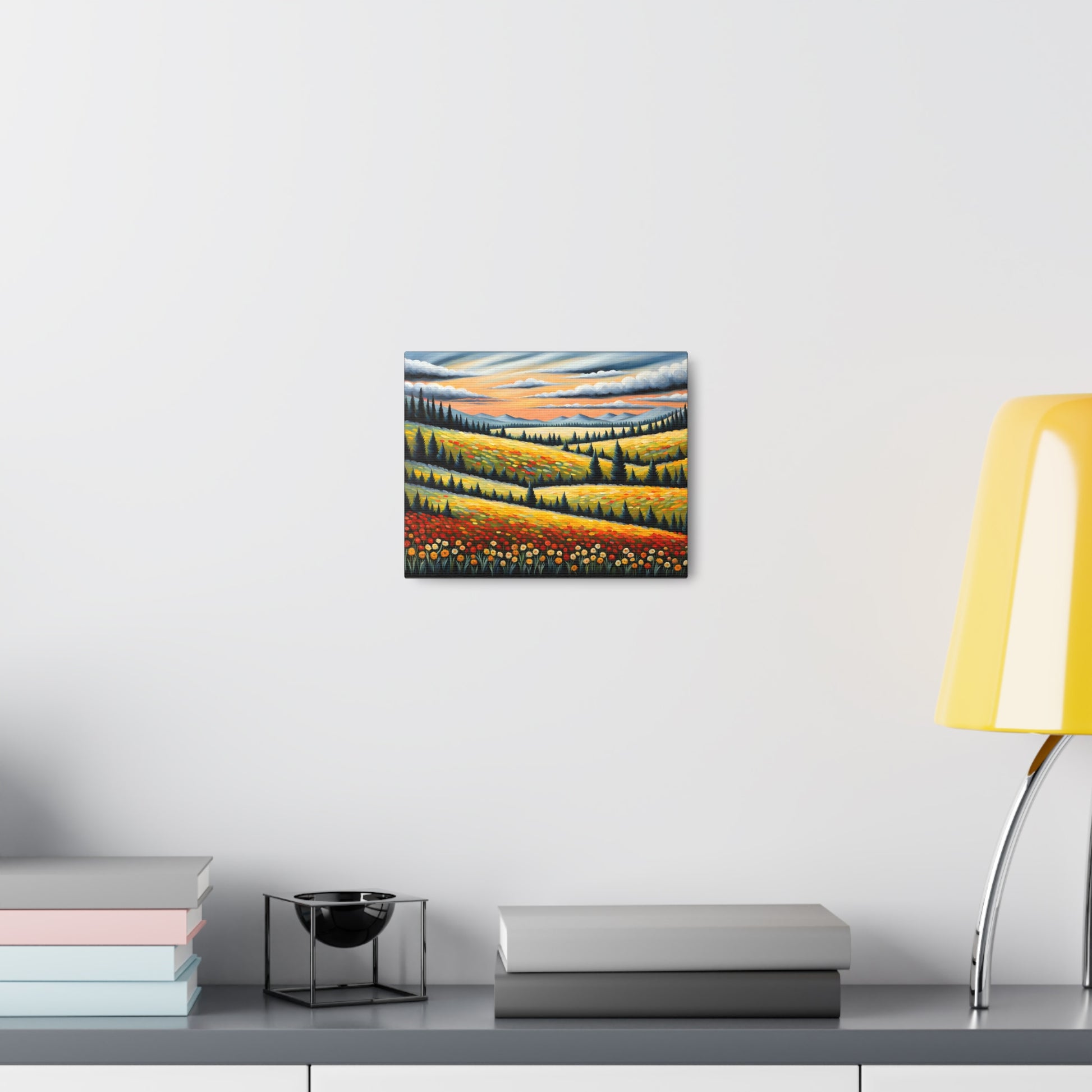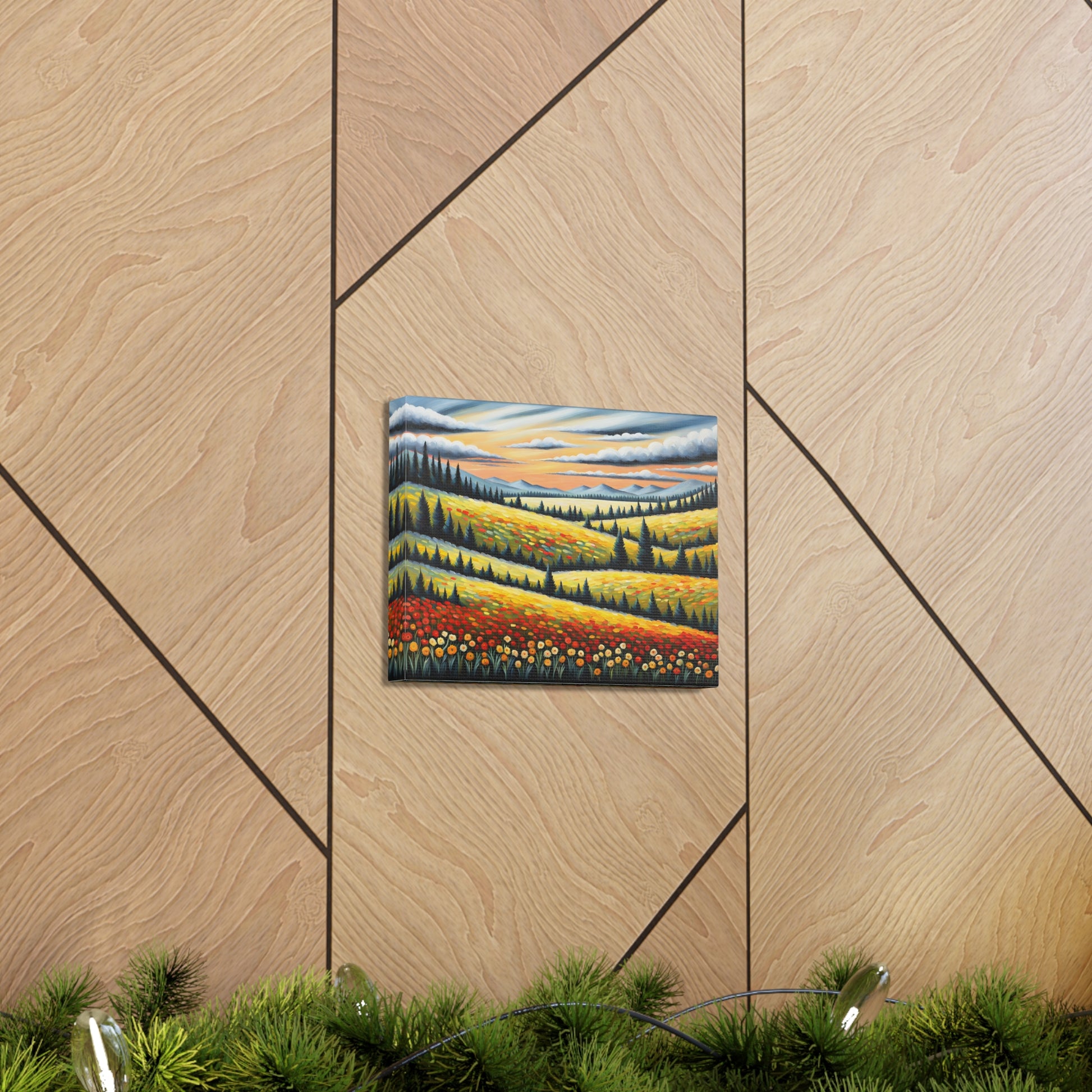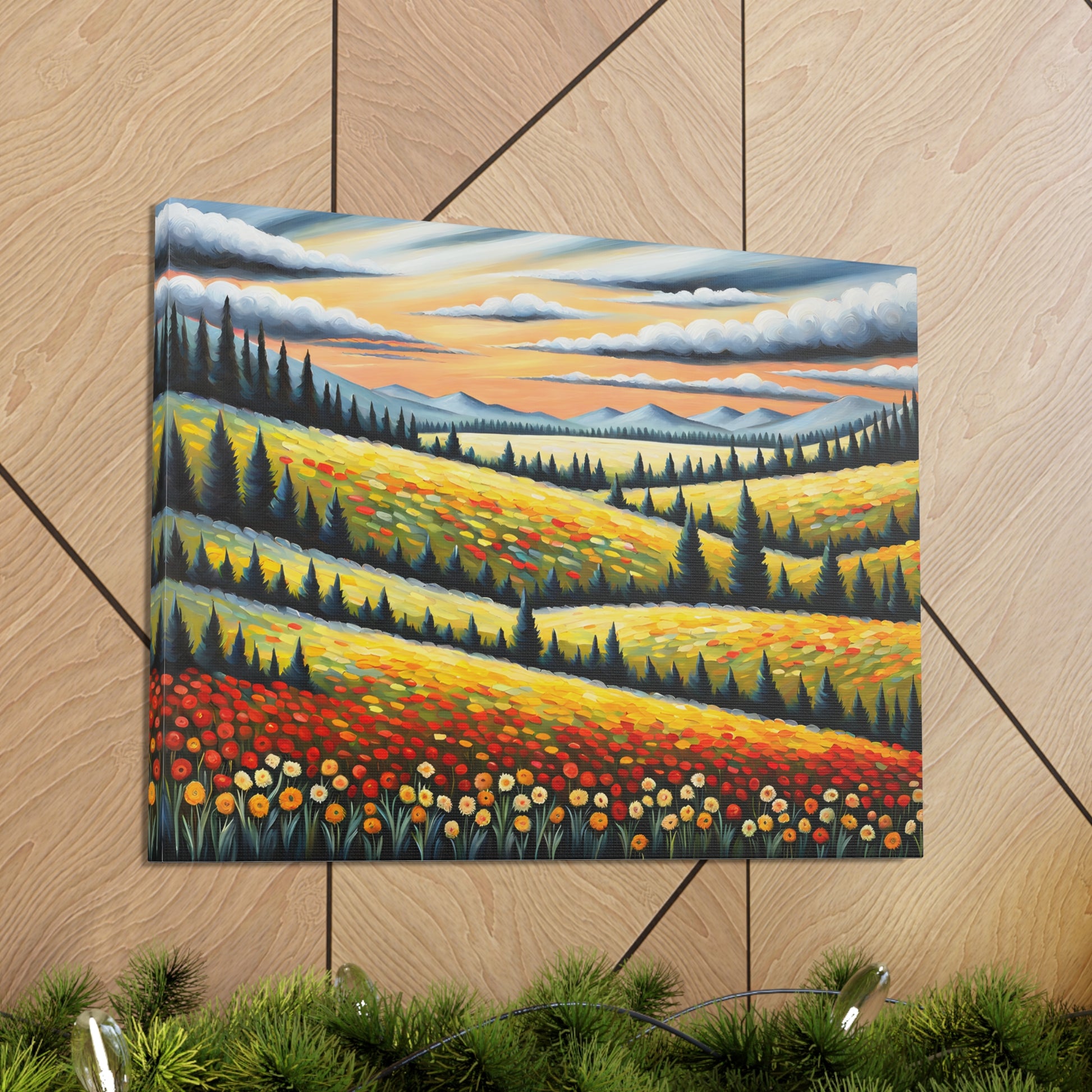 Bask in the vibrant colors of nature with "Wildflower Haven." This oil painting on cotton canvas captures a stunning meadow bursting with wildflowers, set against rolling hills and distant mountains. Perfect for creating a lively and refreshing atmosphere in your indoor space.