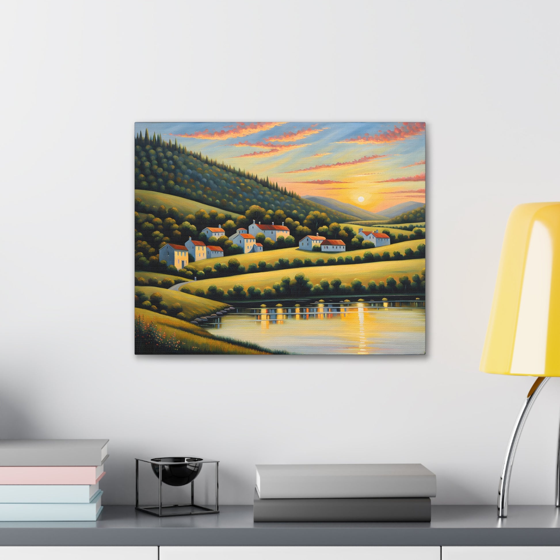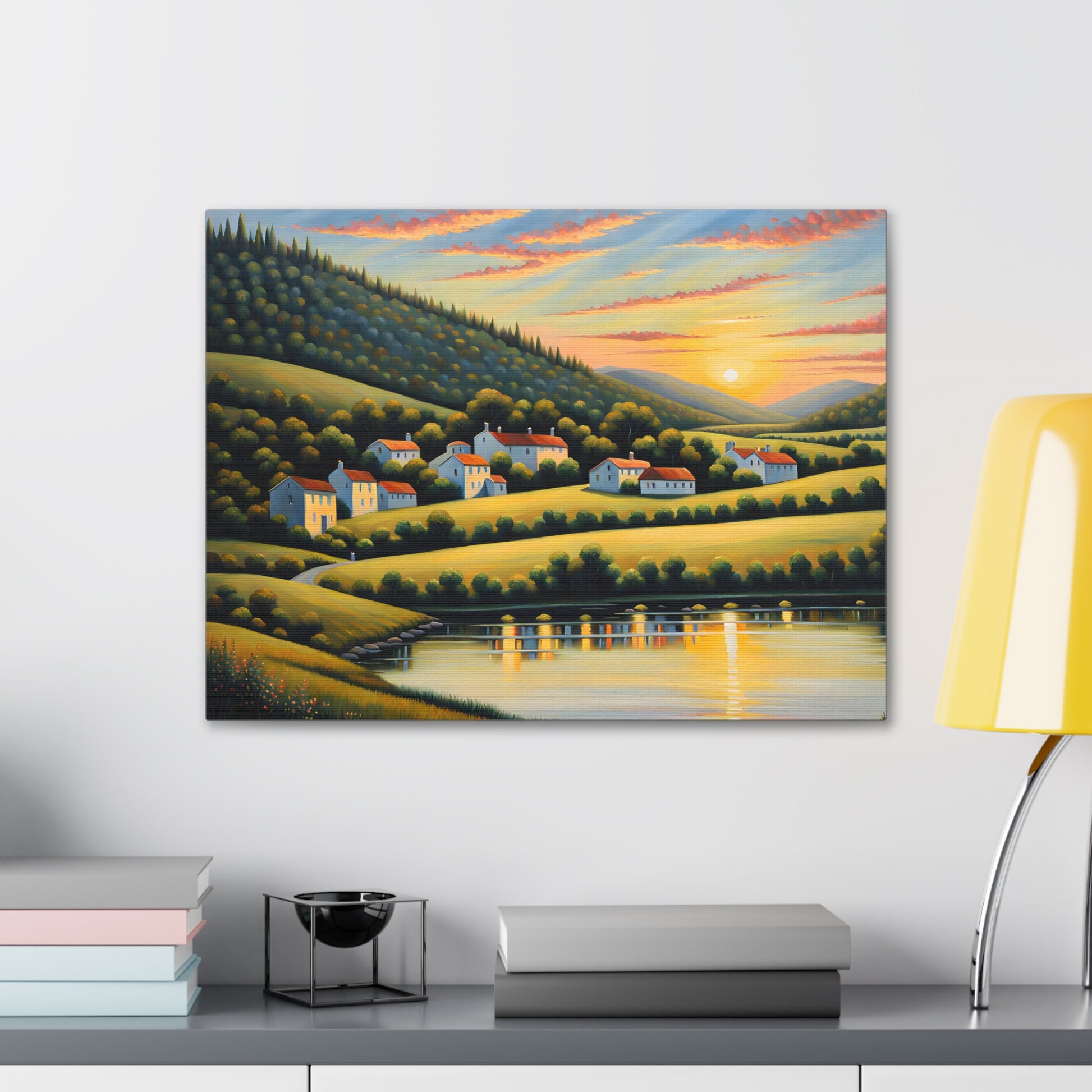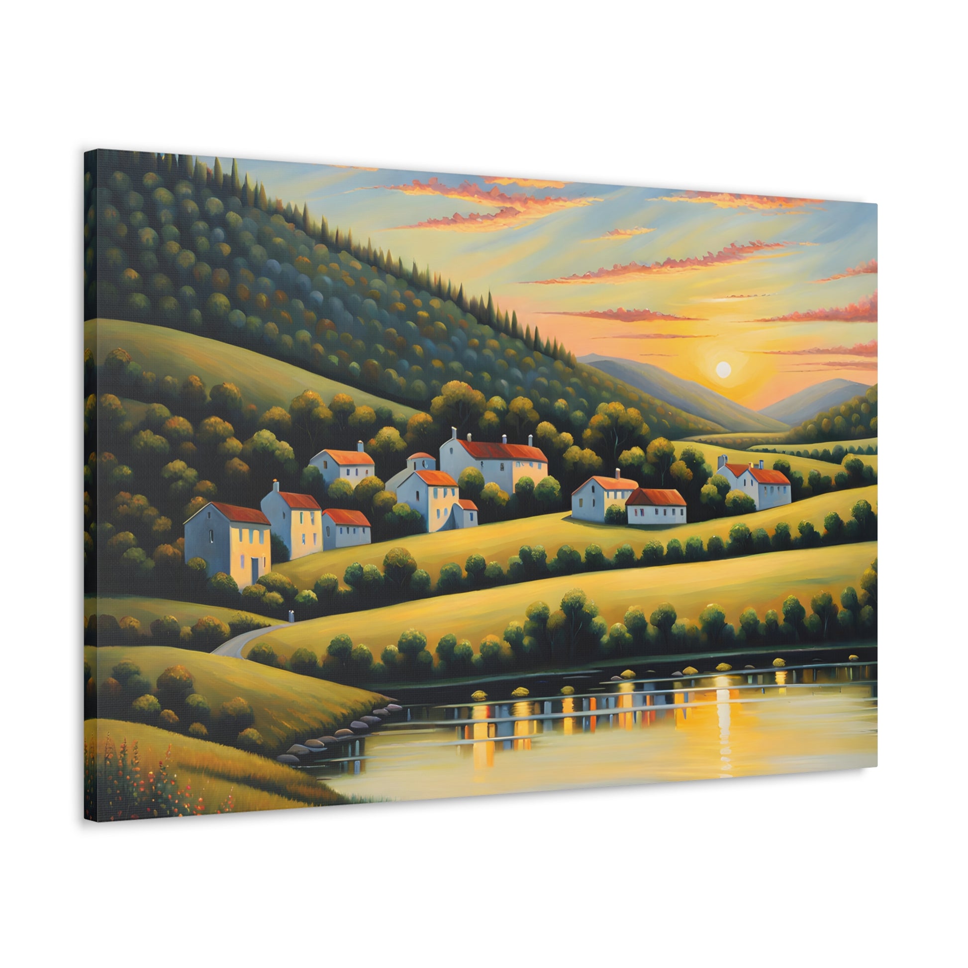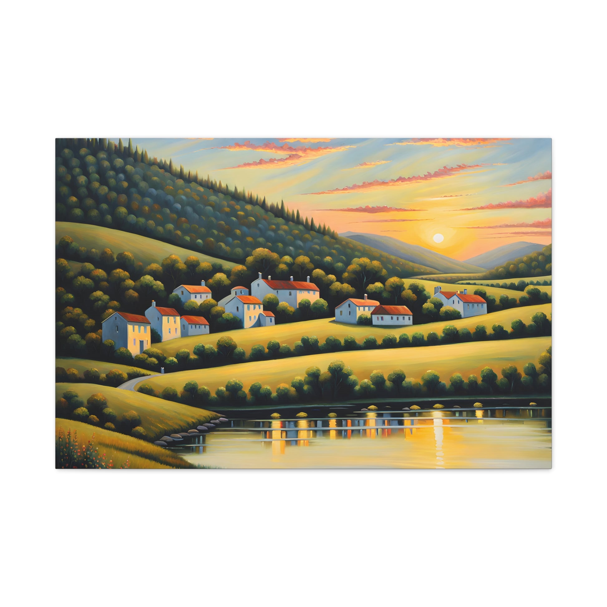 Step into a quaint European village in "Wildflower Path." This oil painting presents a picturesque scene of houses nestled in rolling hills, under a glowing sky at sunset, reflecting off a peaceful lake.