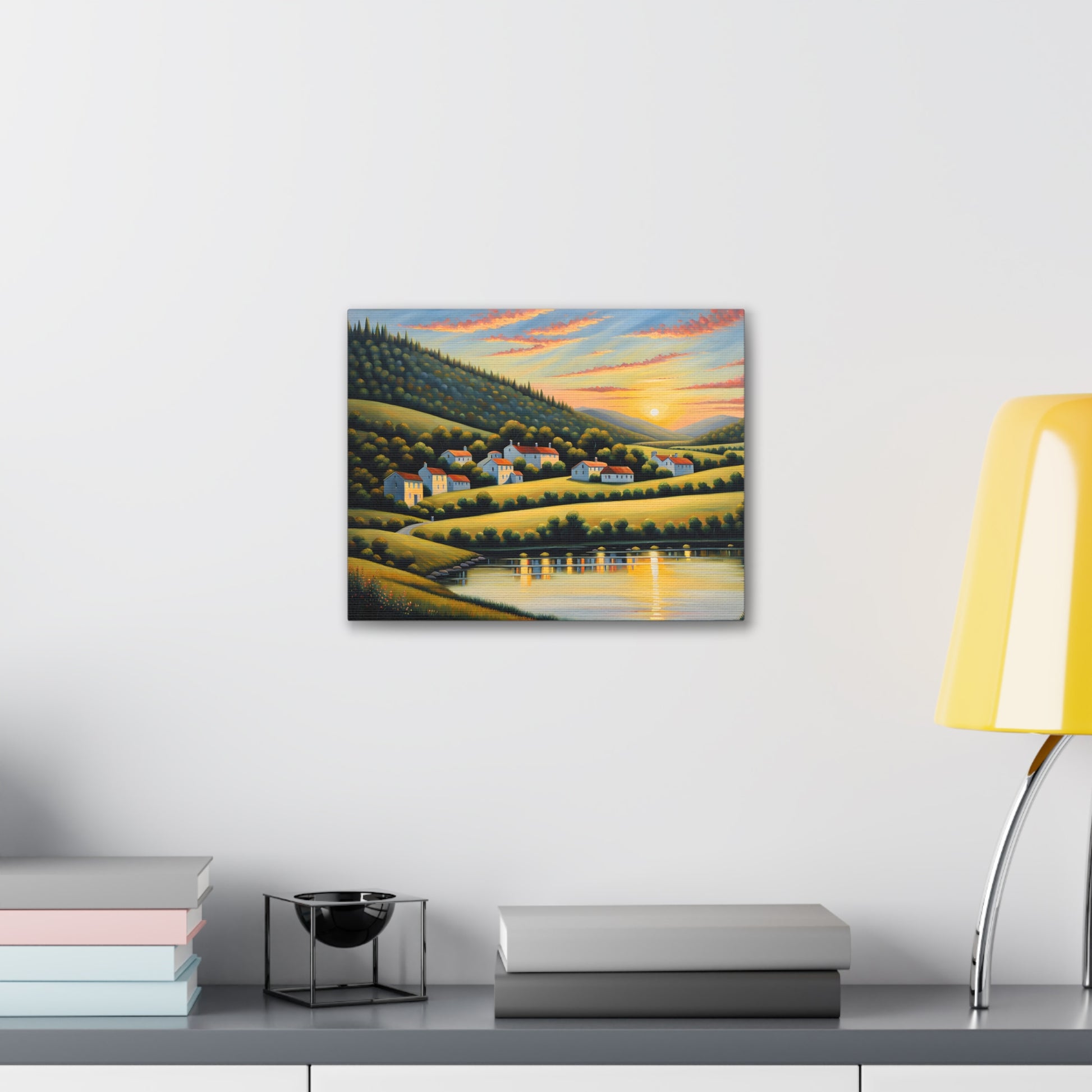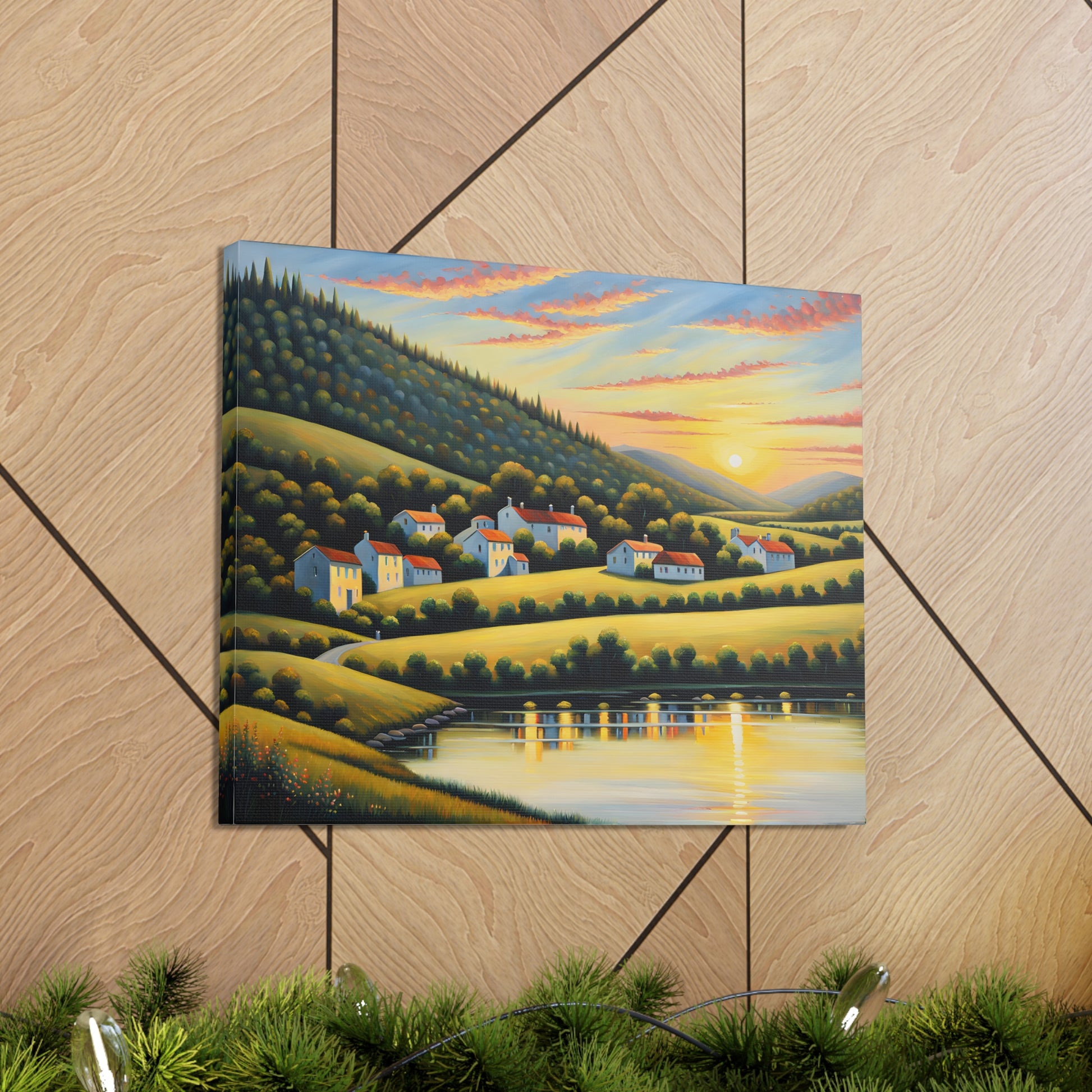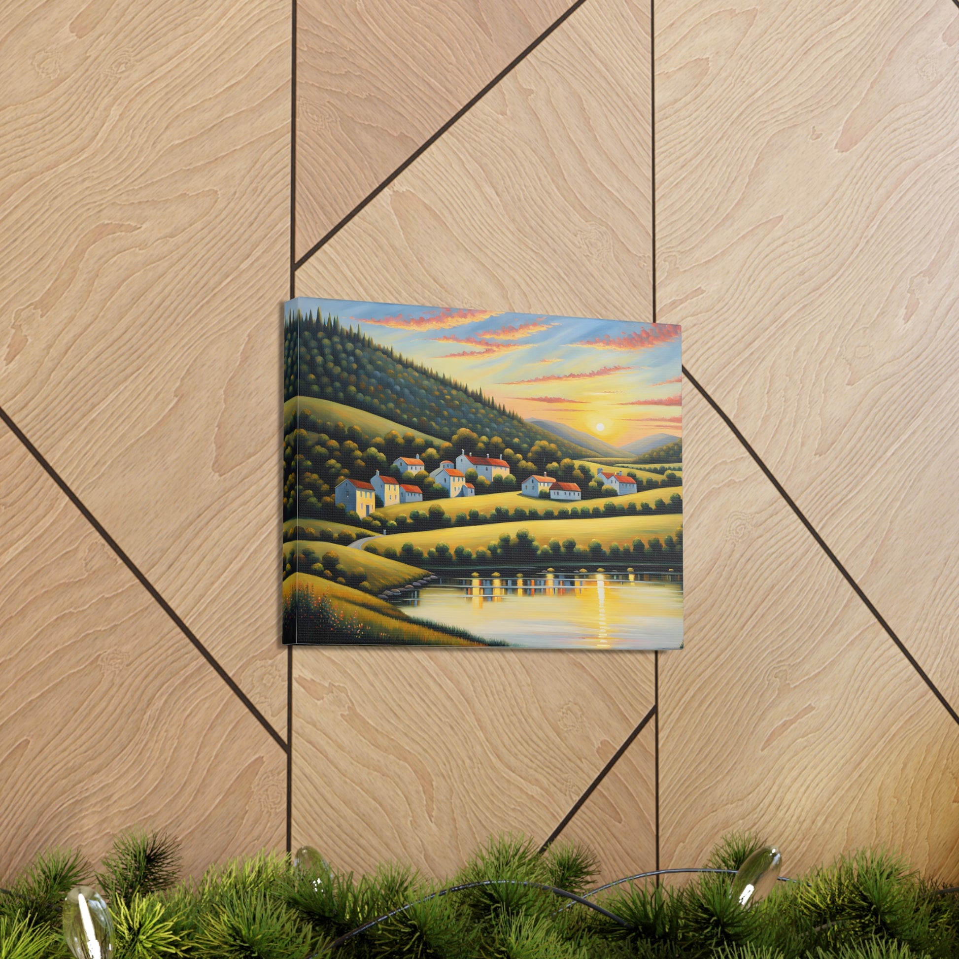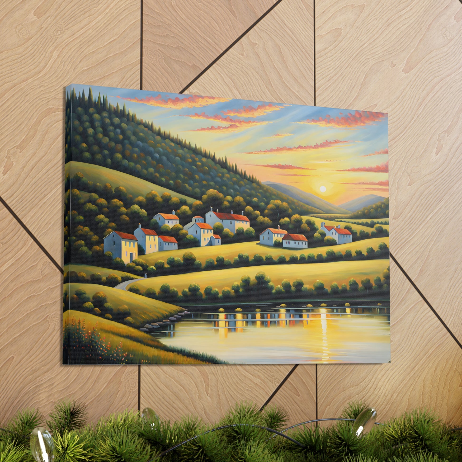 Step into a quaint European village in "Wildflower Path." This oil painting presents a picturesque scene of houses nestled in rolling hills, under a glowing sky at sunset, reflecting off a peaceful lake.