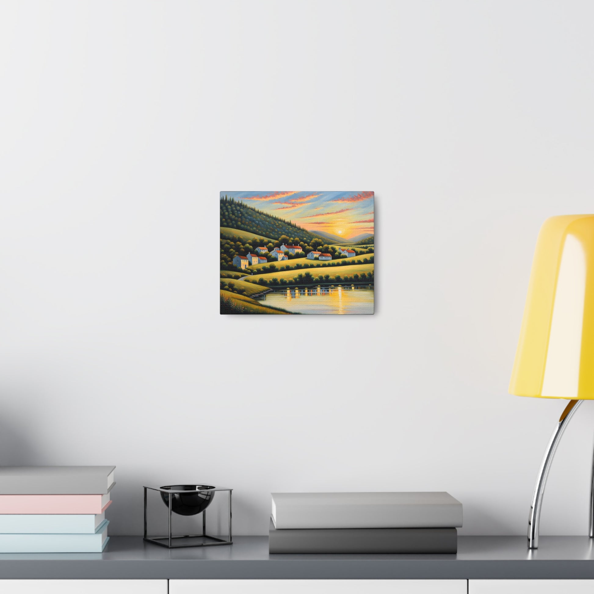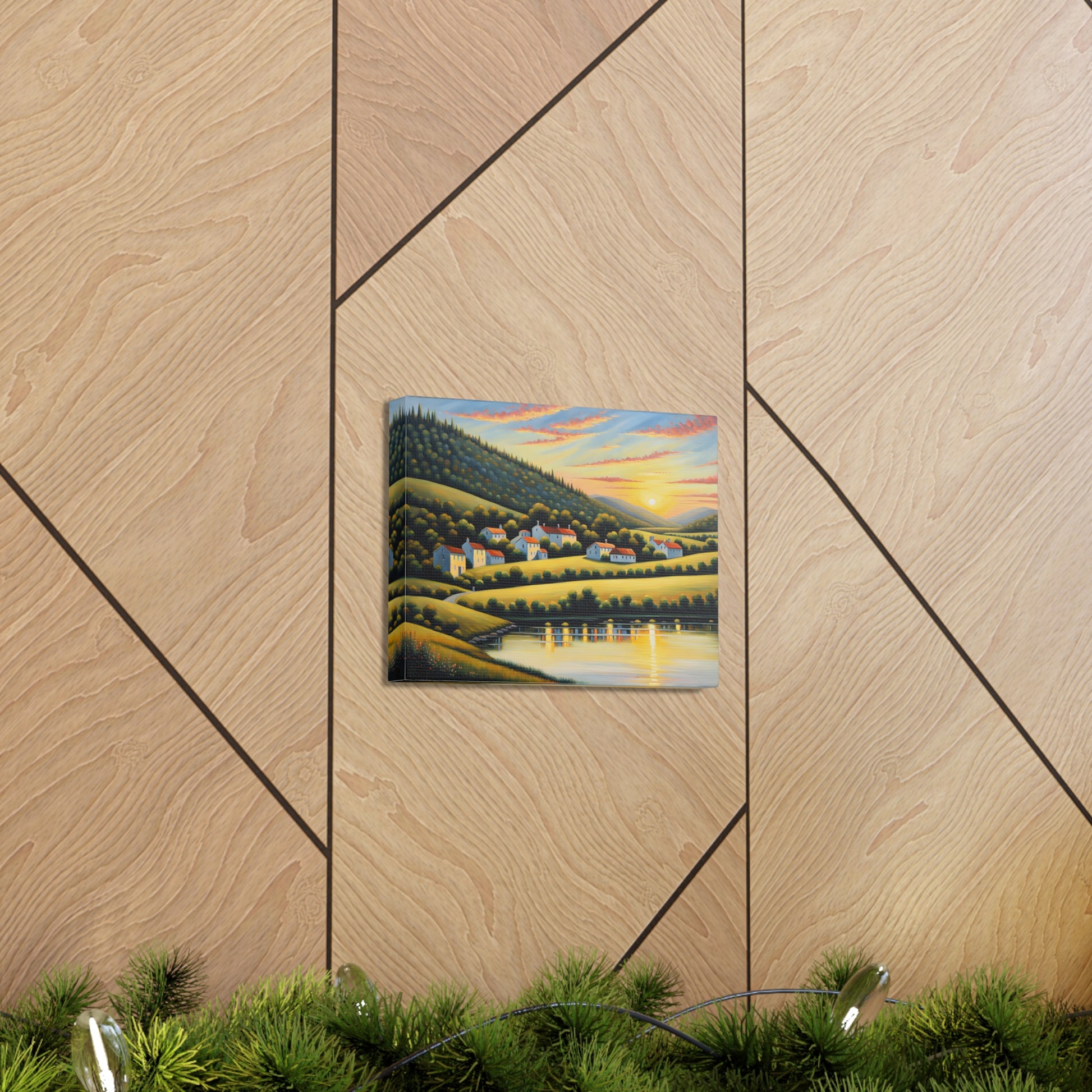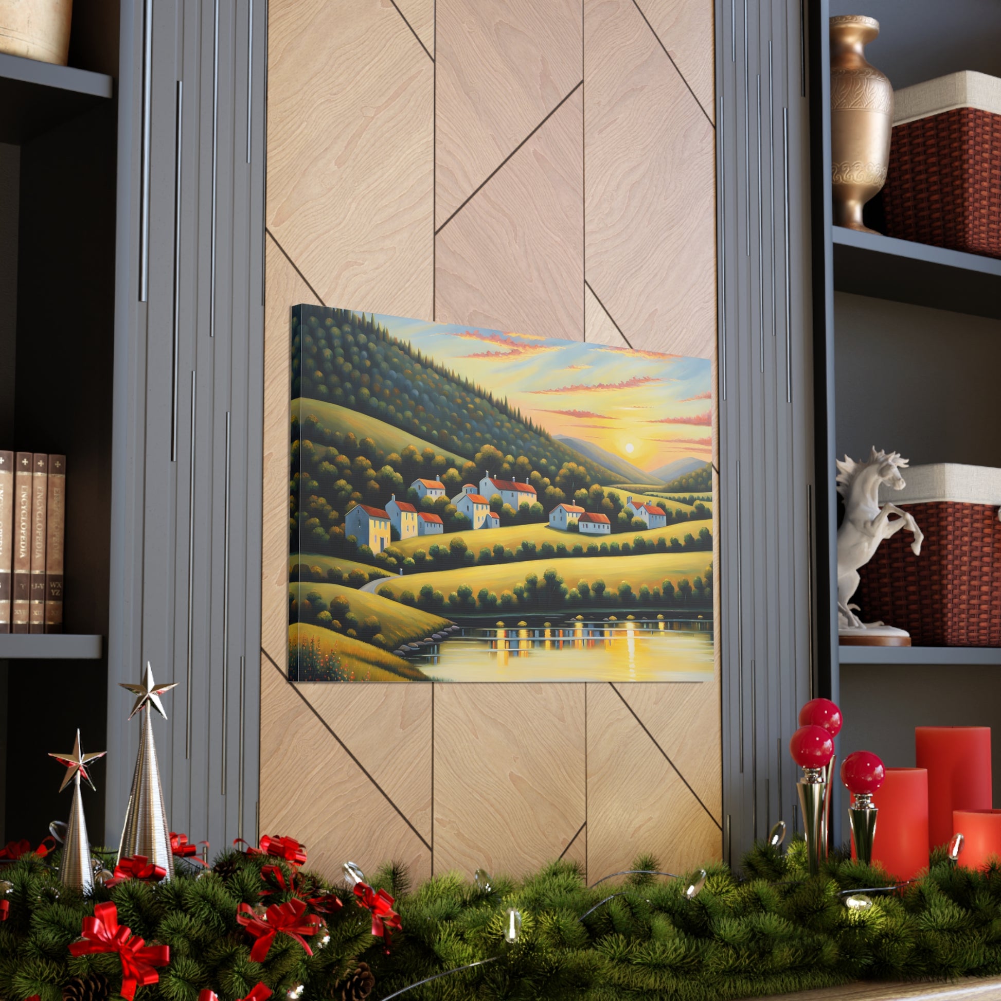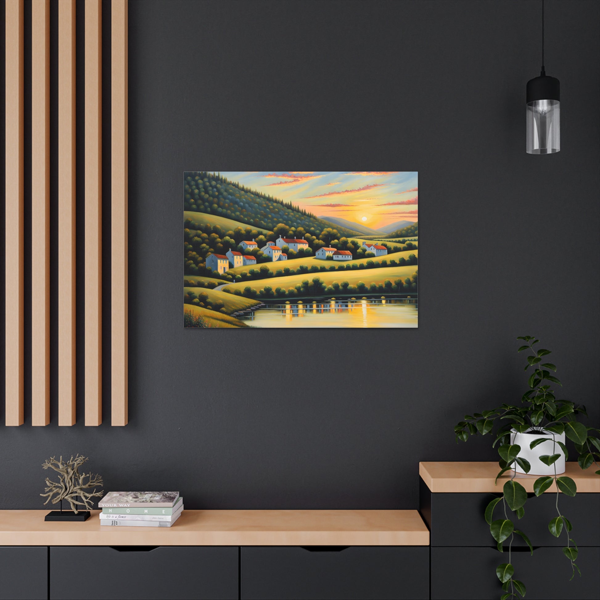 Step into a quaint European village in "Wildflower Path." This oil painting presents a picturesque scene of houses nestled in rolling hills, under a glowing sky at sunset, reflecting off a peaceful lake.
