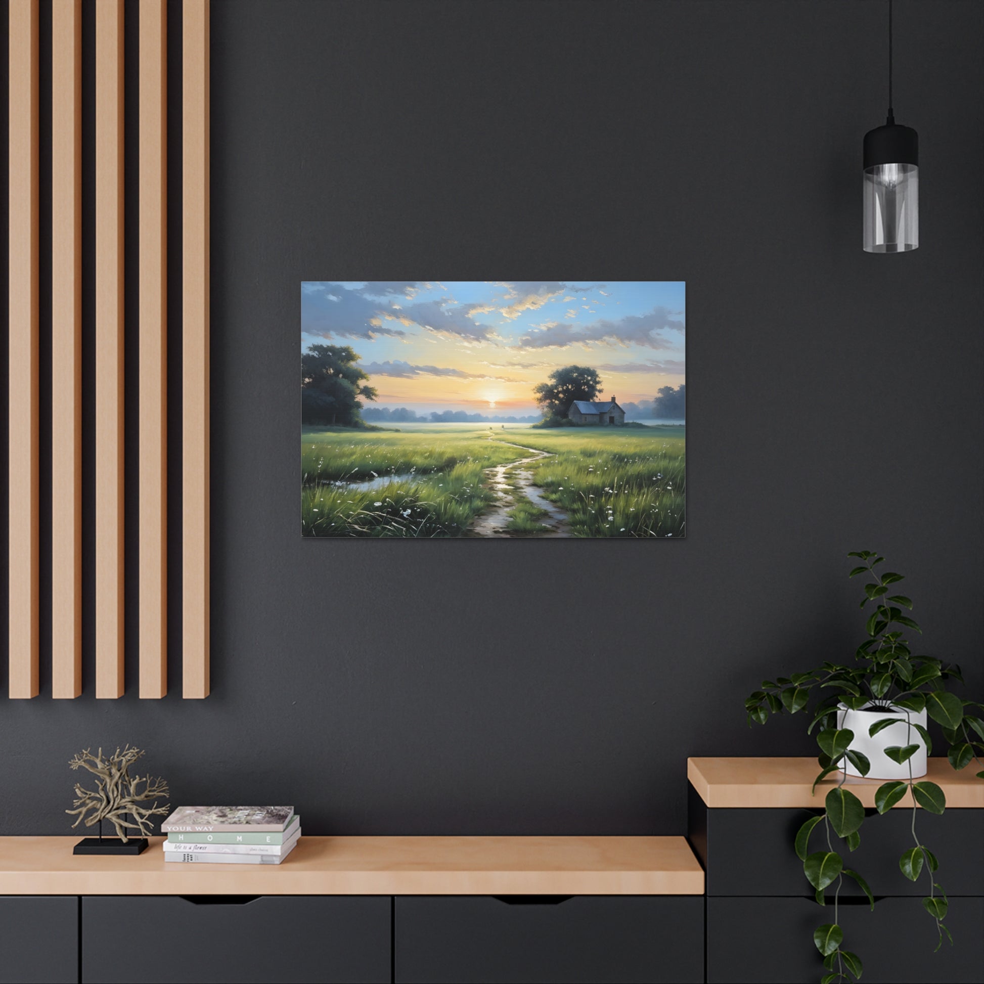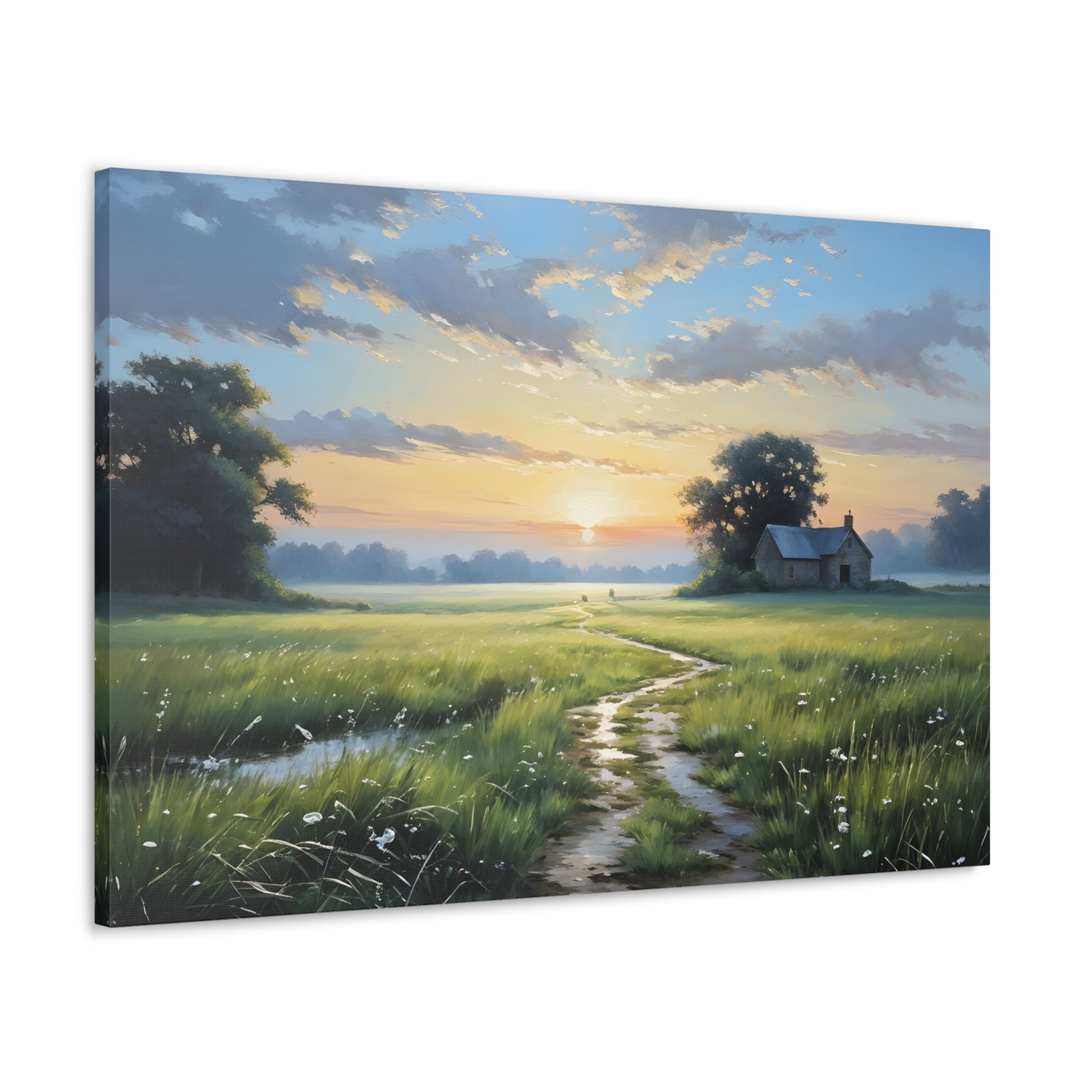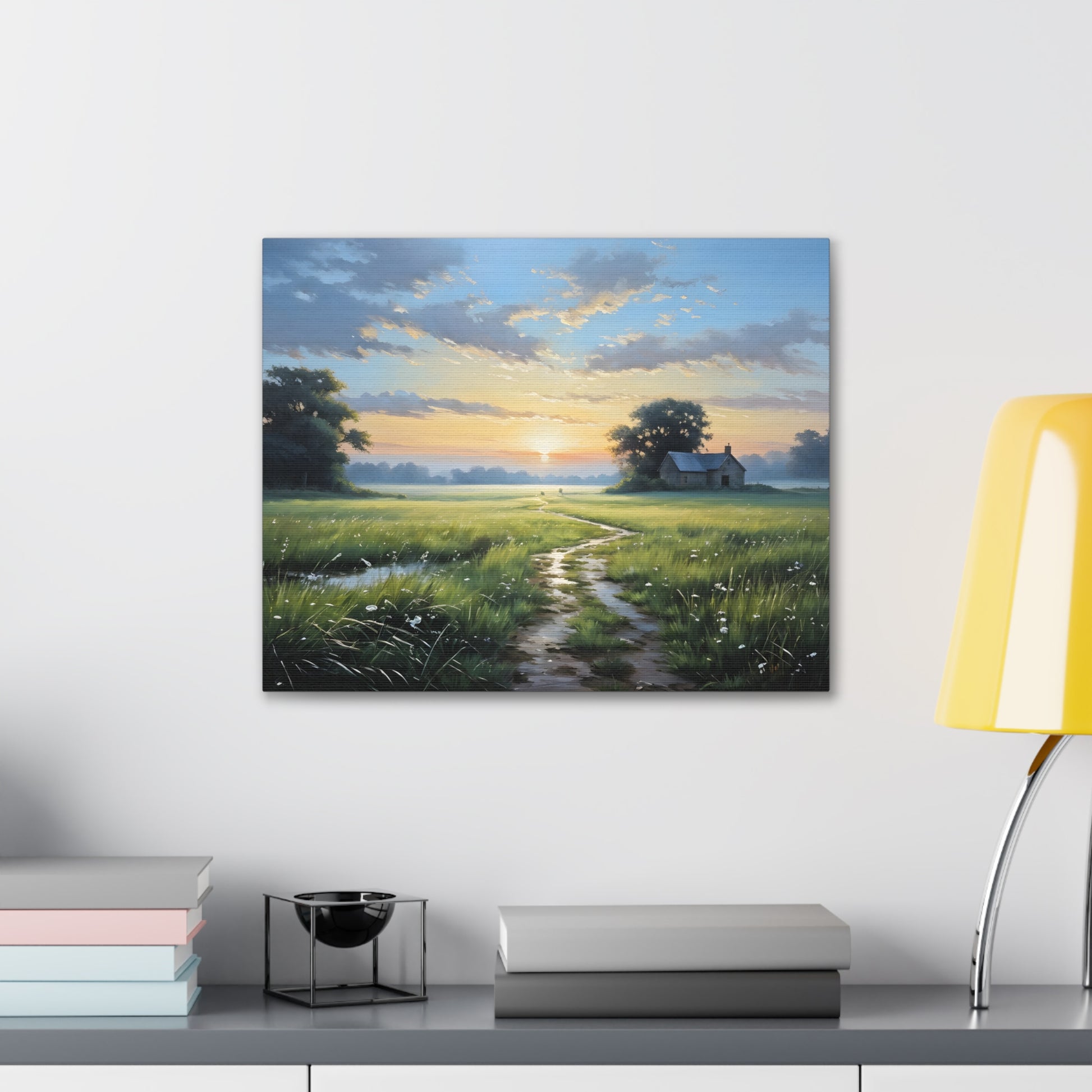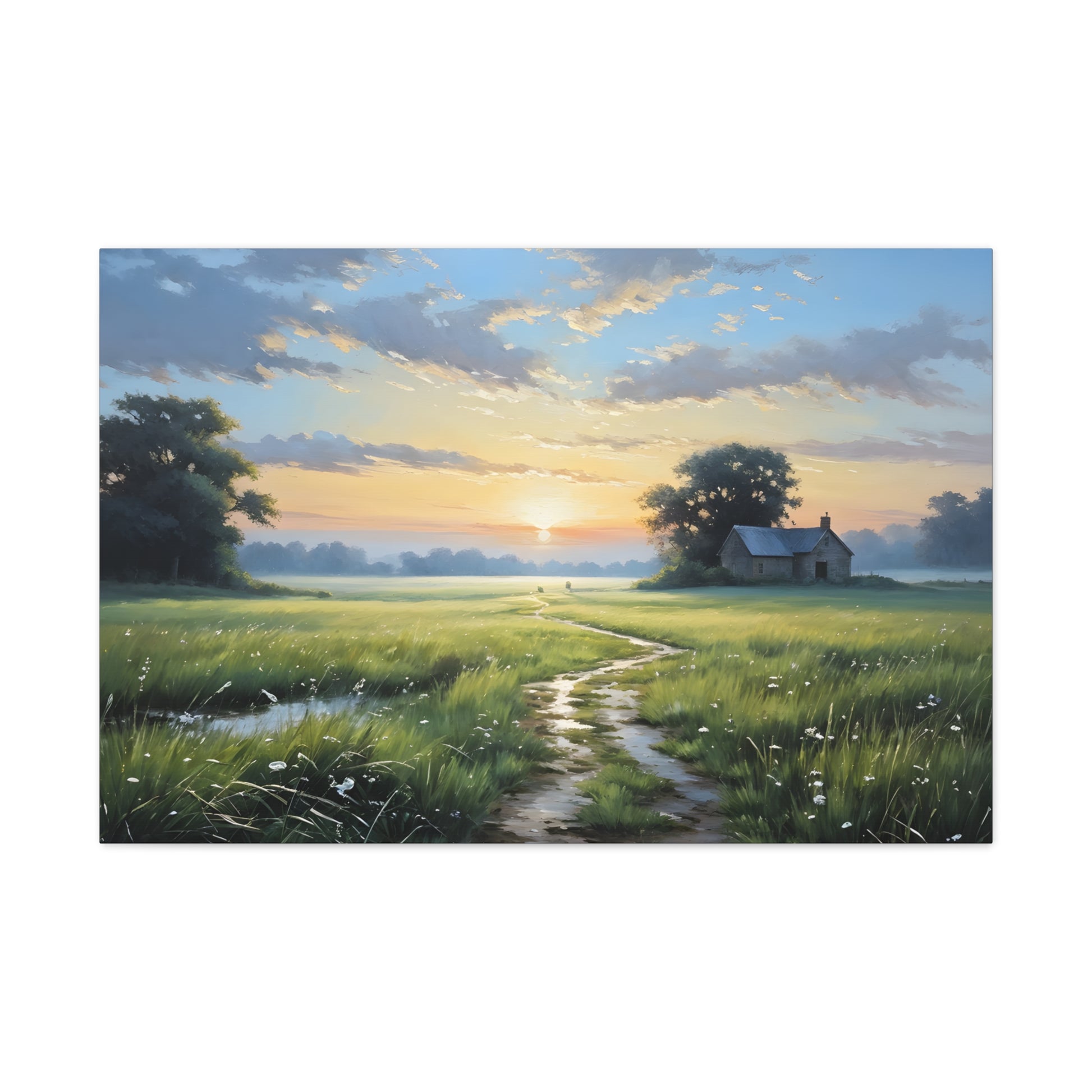 "Windswept Plains" offers a stunning view of rolling fields at sunset, where the golden hues of the land meet the vibrant colors of the sky. This painting brings warmth and openness to any room.