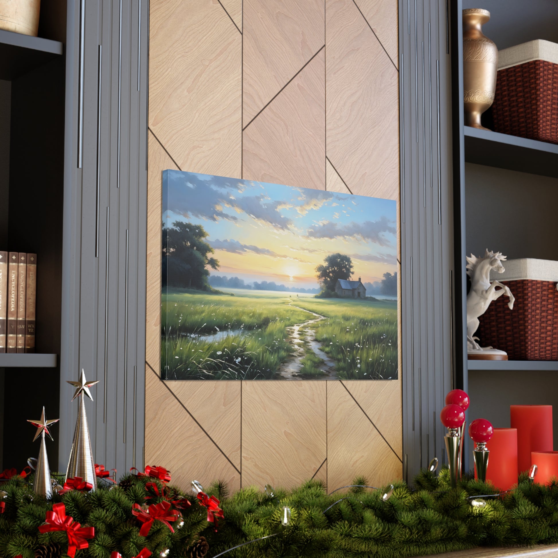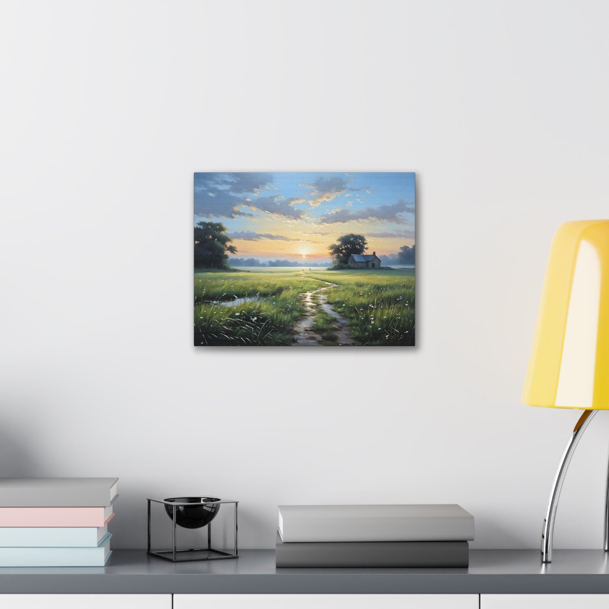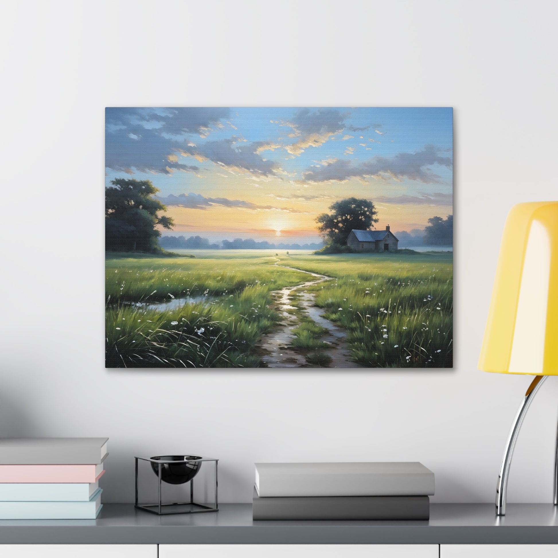 "Windswept Plains" offers a stunning view of rolling fields at sunset, where the golden hues of the land meet the vibrant colors of the sky. This painting brings warmth and openness to any room.