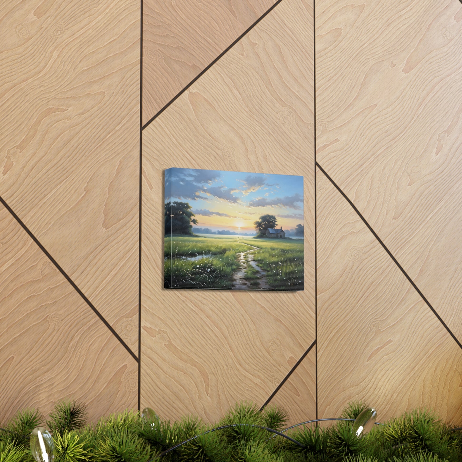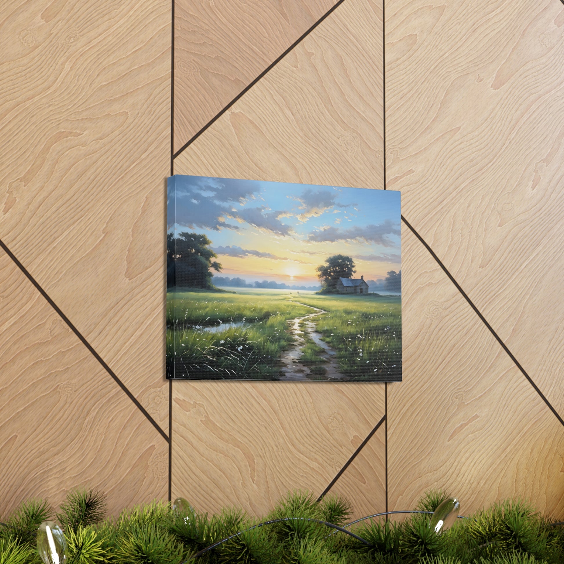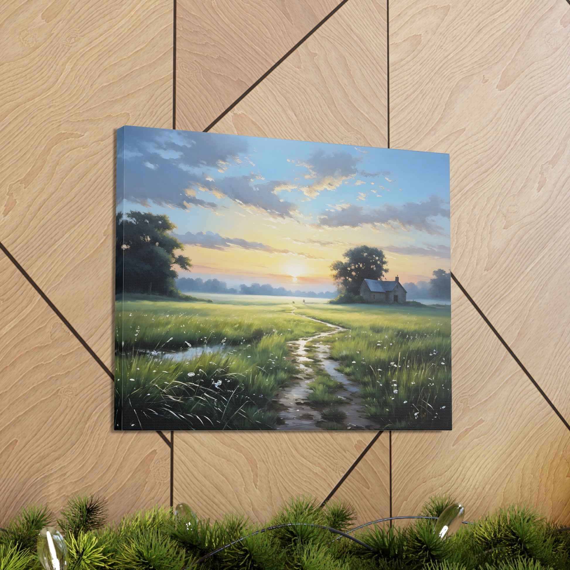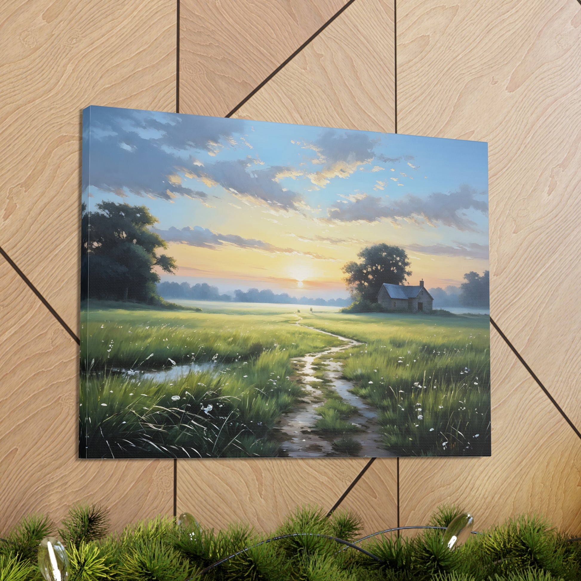 "Windswept Plains" offers a stunning view of rolling fields at sunset, where the golden hues of the land meet the vibrant colors of the sky. This painting brings warmth and openness to any room.