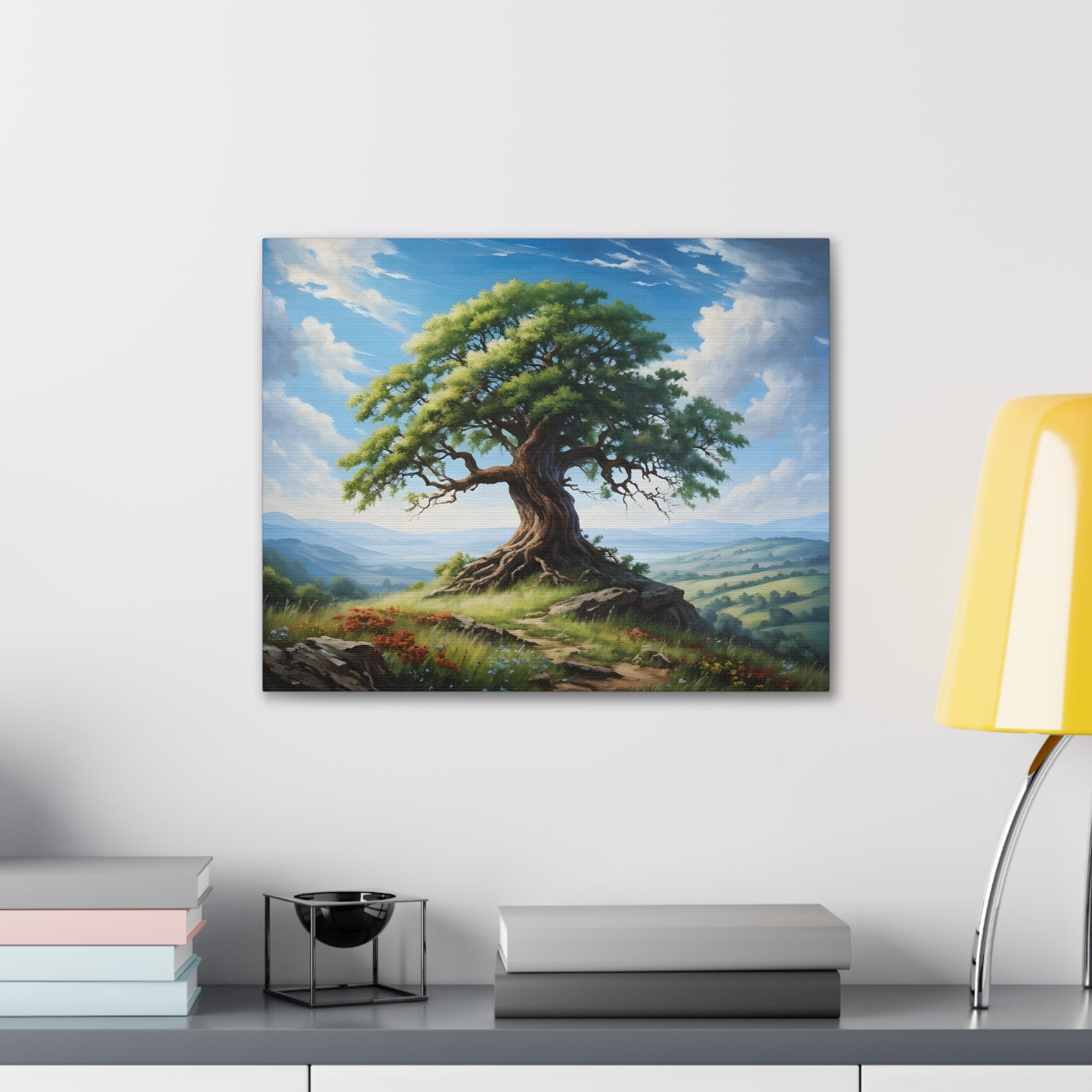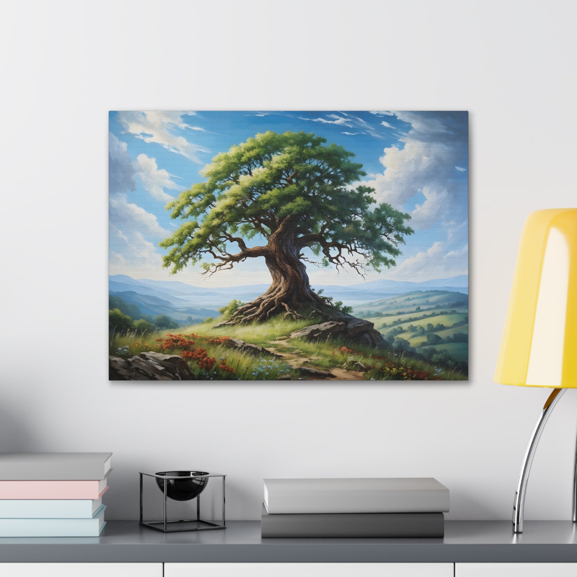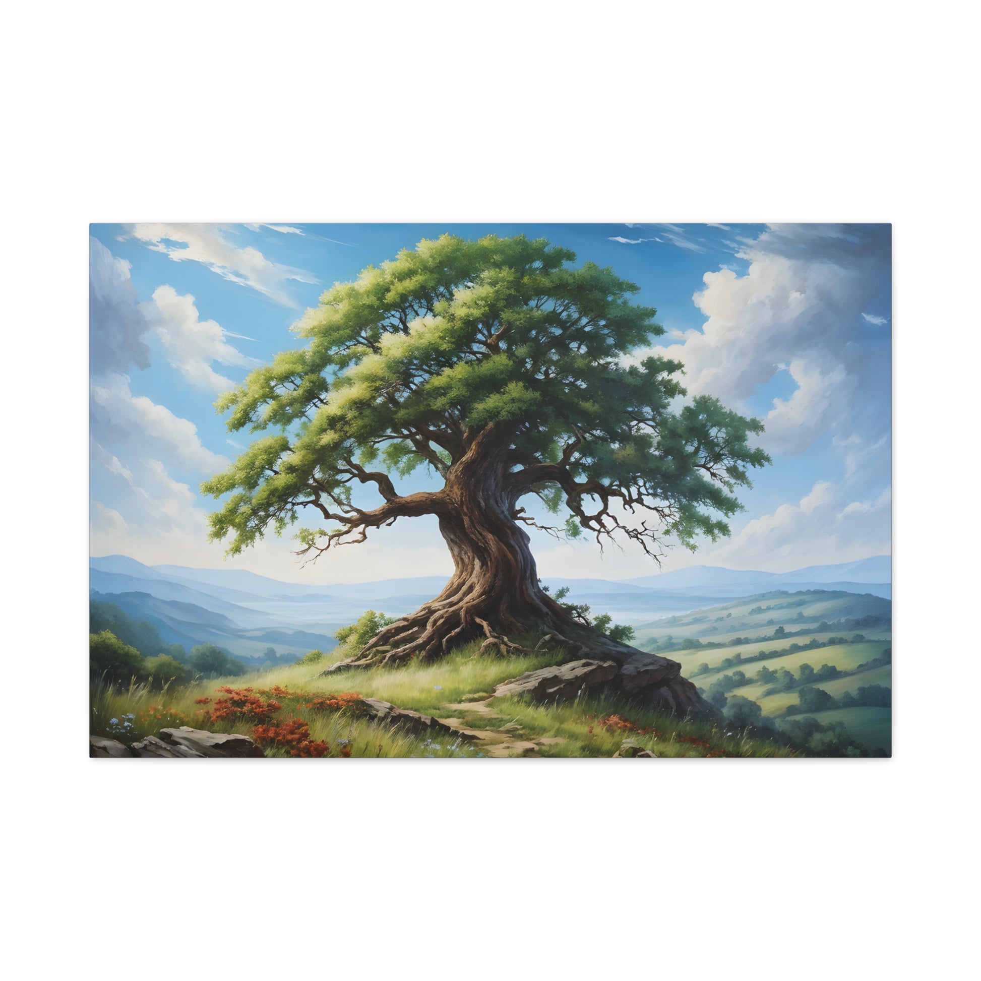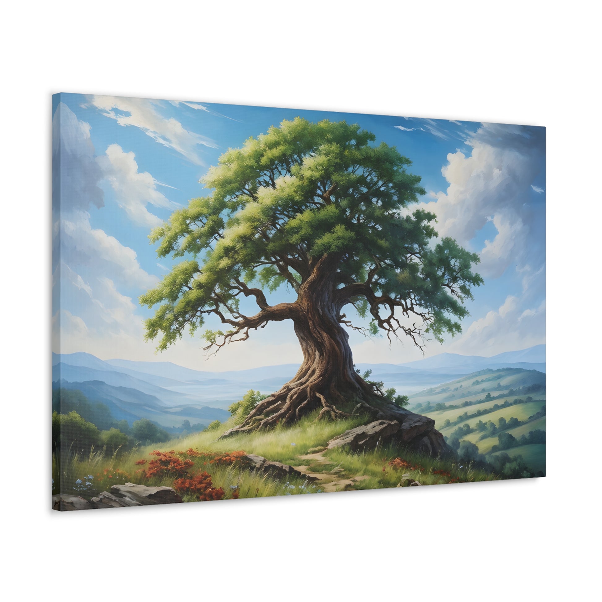 "Woodland Peace" portrays an iconic, ancient tree standing majestically on a hill, overlooking a distant valley. This oil painting captures the grandeur of nature and the serene beauty of a timeless landscape.