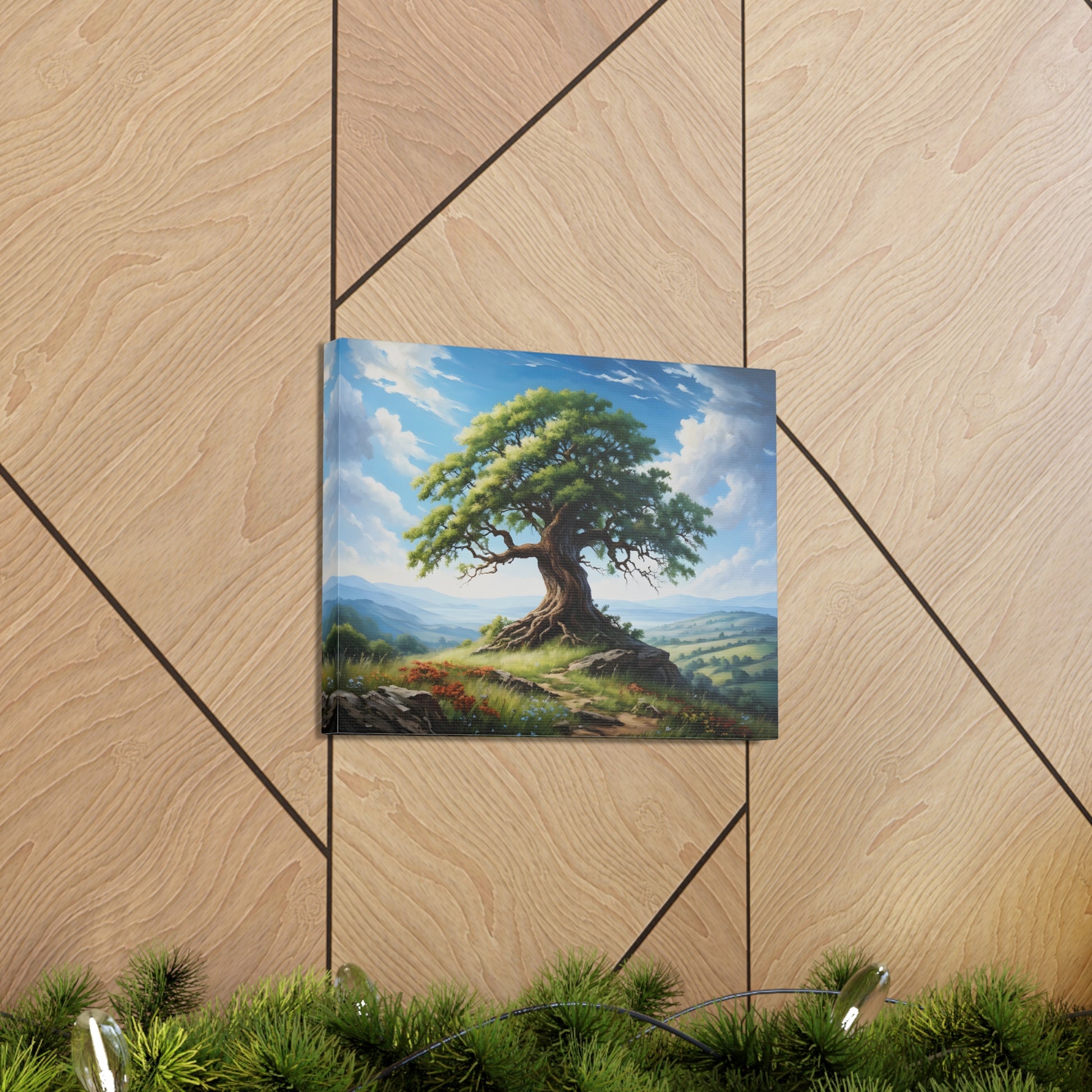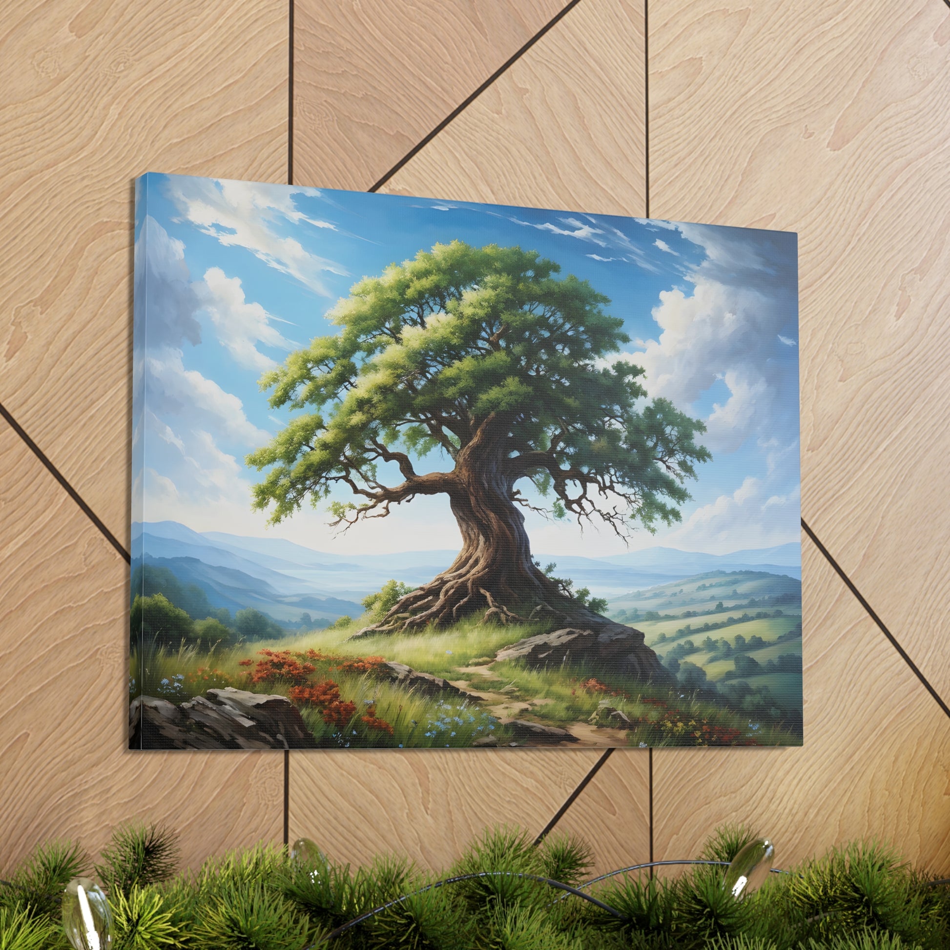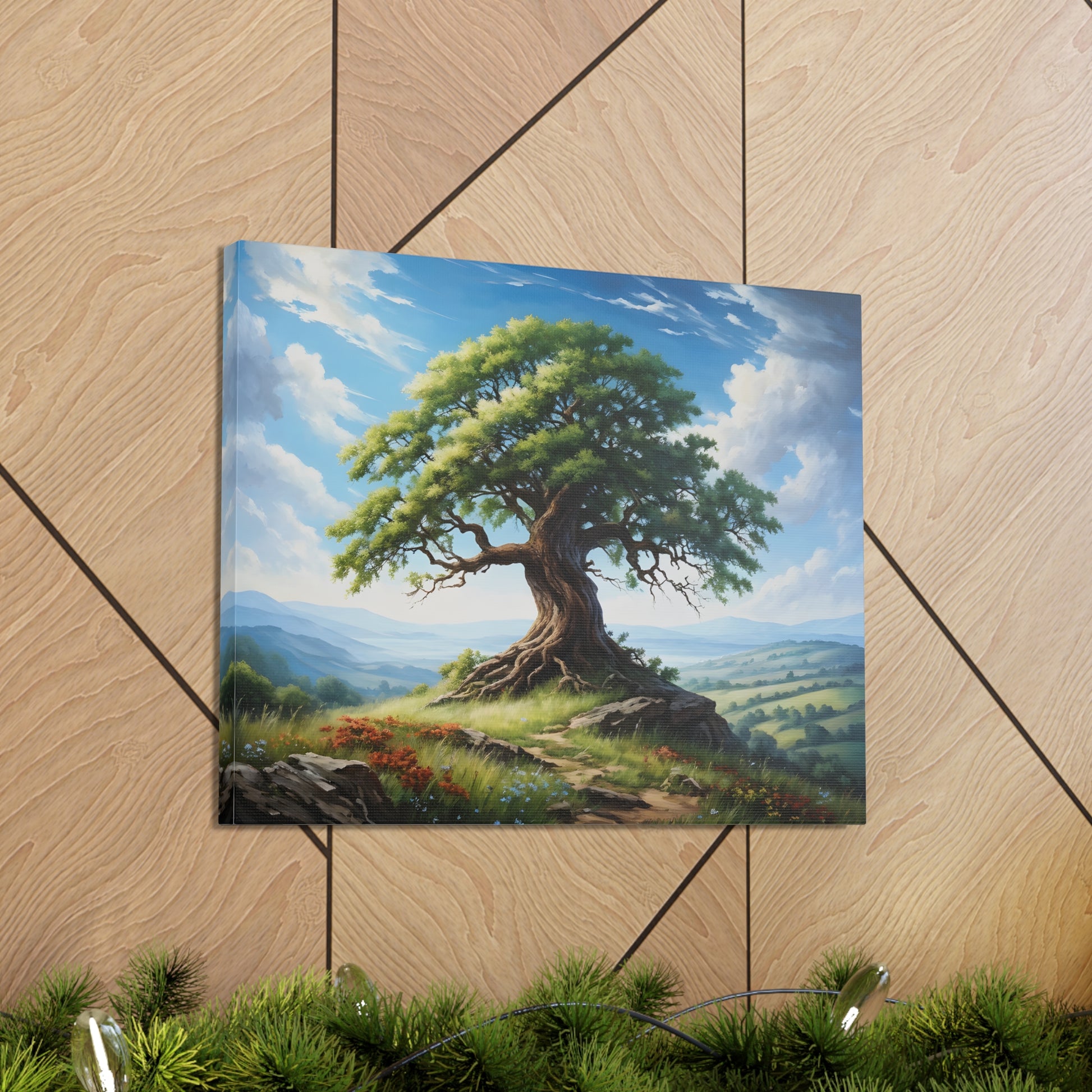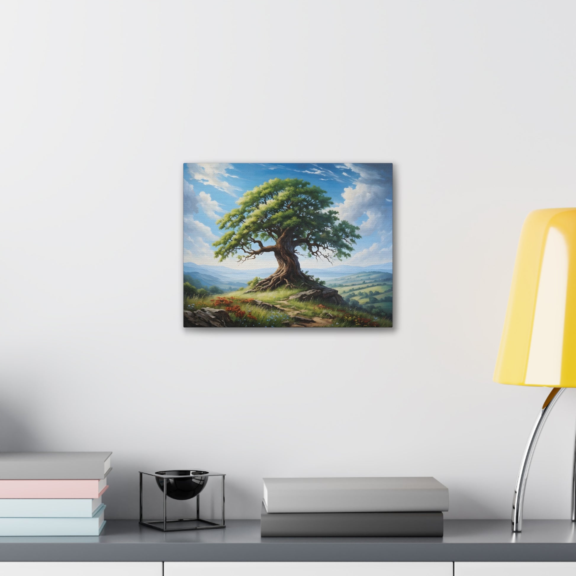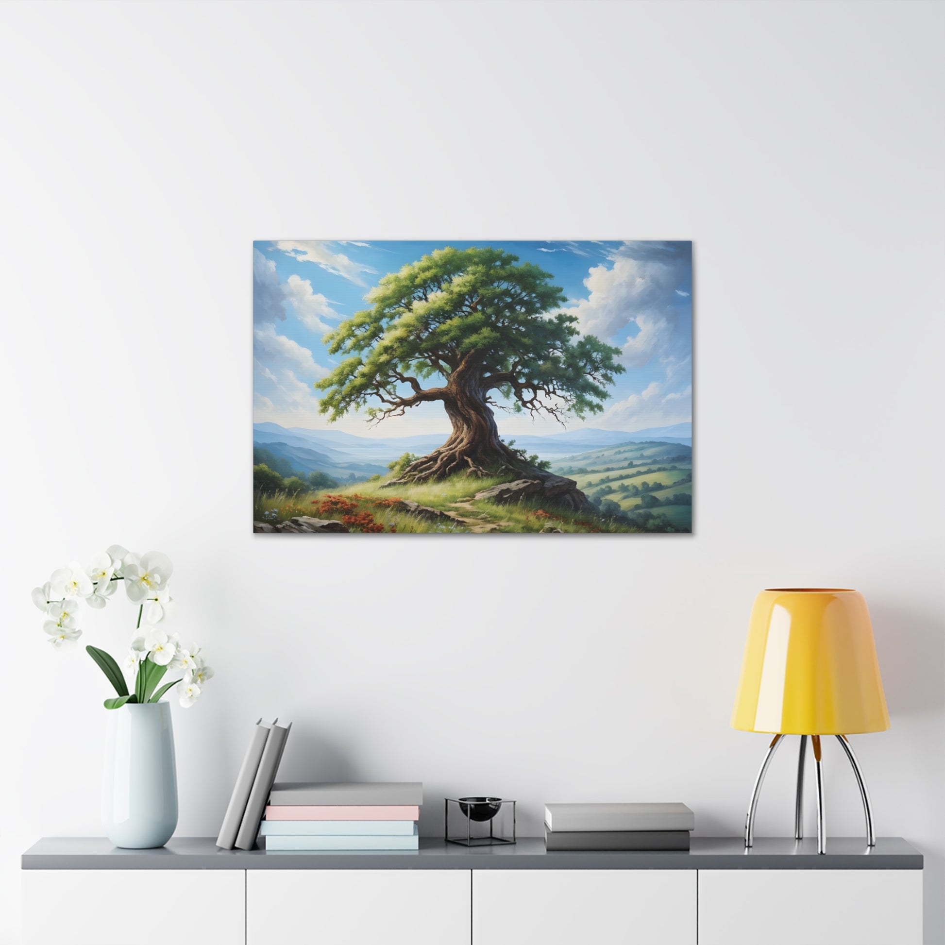 "Woodland Peace" portrays an iconic, ancient tree standing majestically on a hill, overlooking a distant valley. This oil painting captures the grandeur of nature and the serene beauty of a timeless landscape.