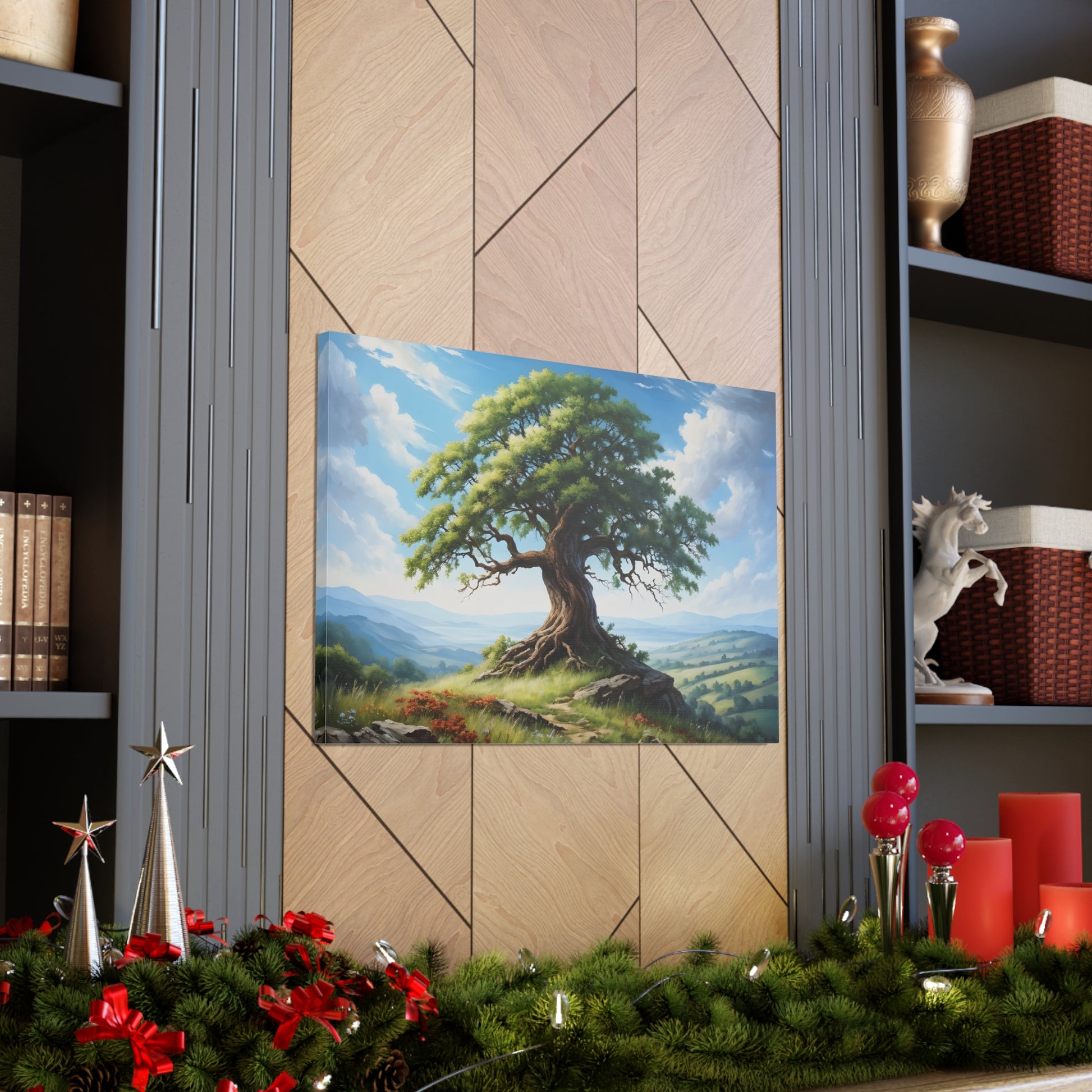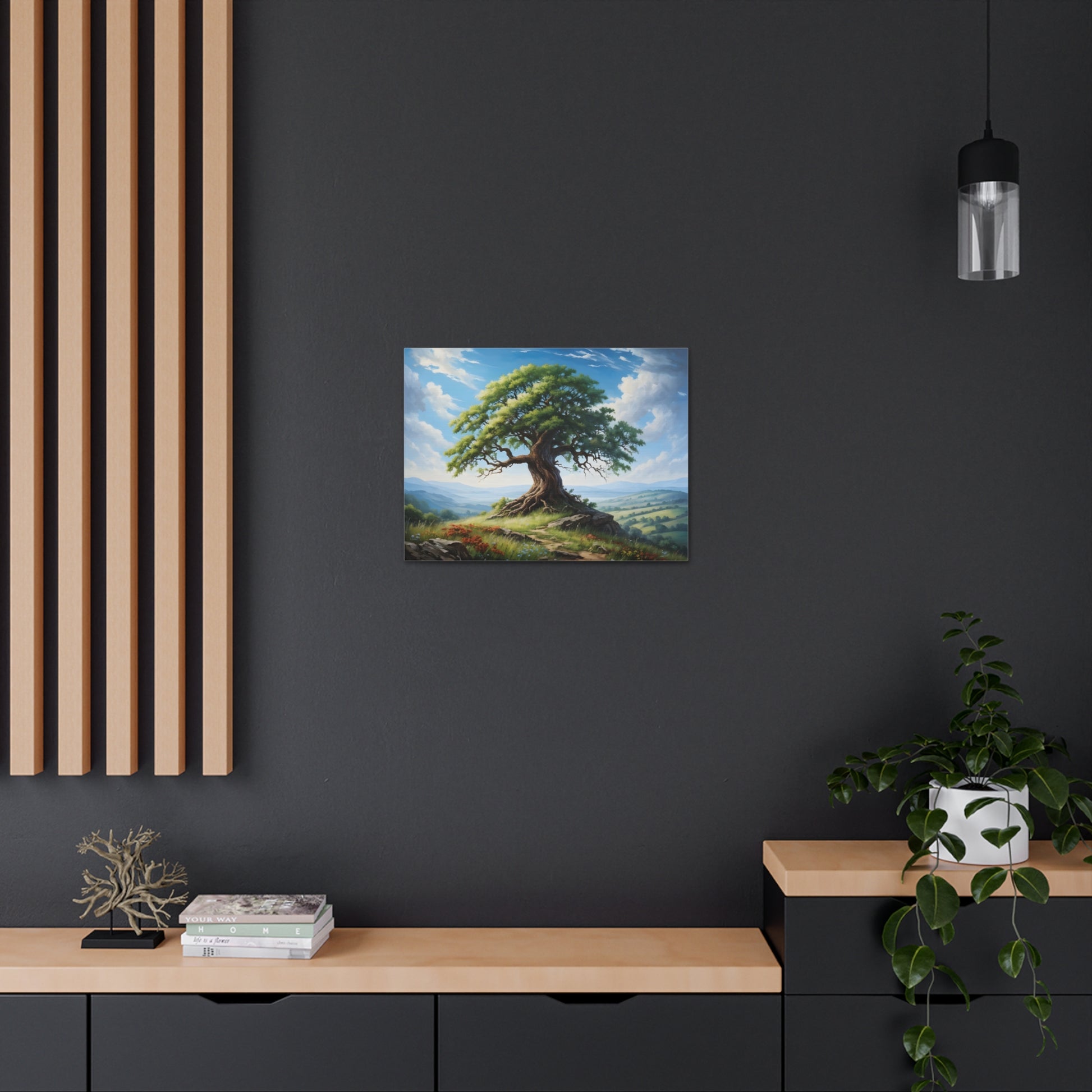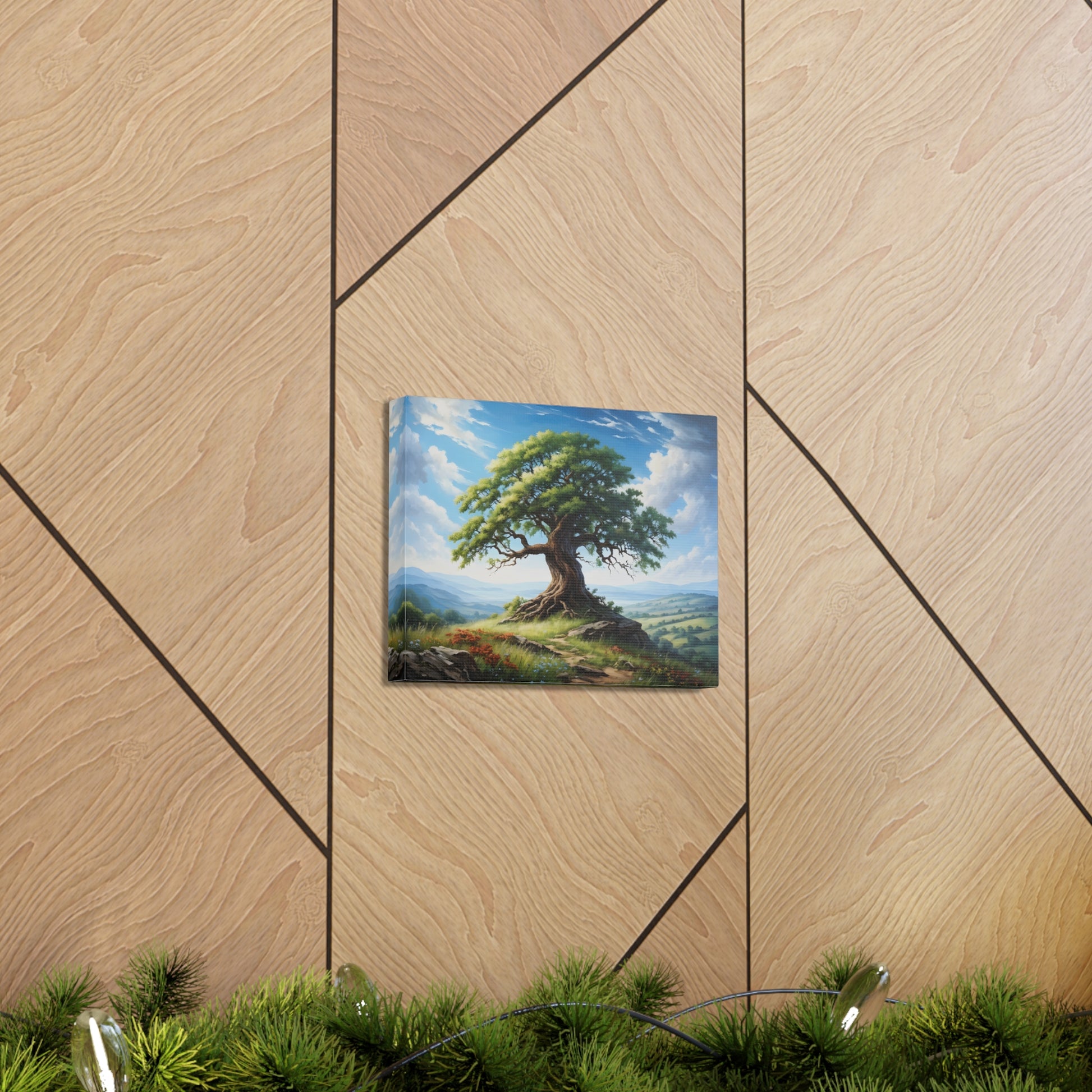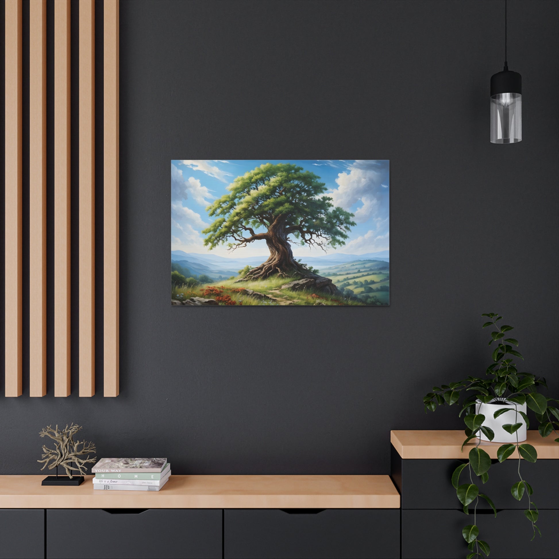 "Woodland Peace" portrays an iconic, ancient tree standing majestically on a hill, overlooking a distant valley. This oil painting captures the grandeur of nature and the serene beauty of a timeless landscape.